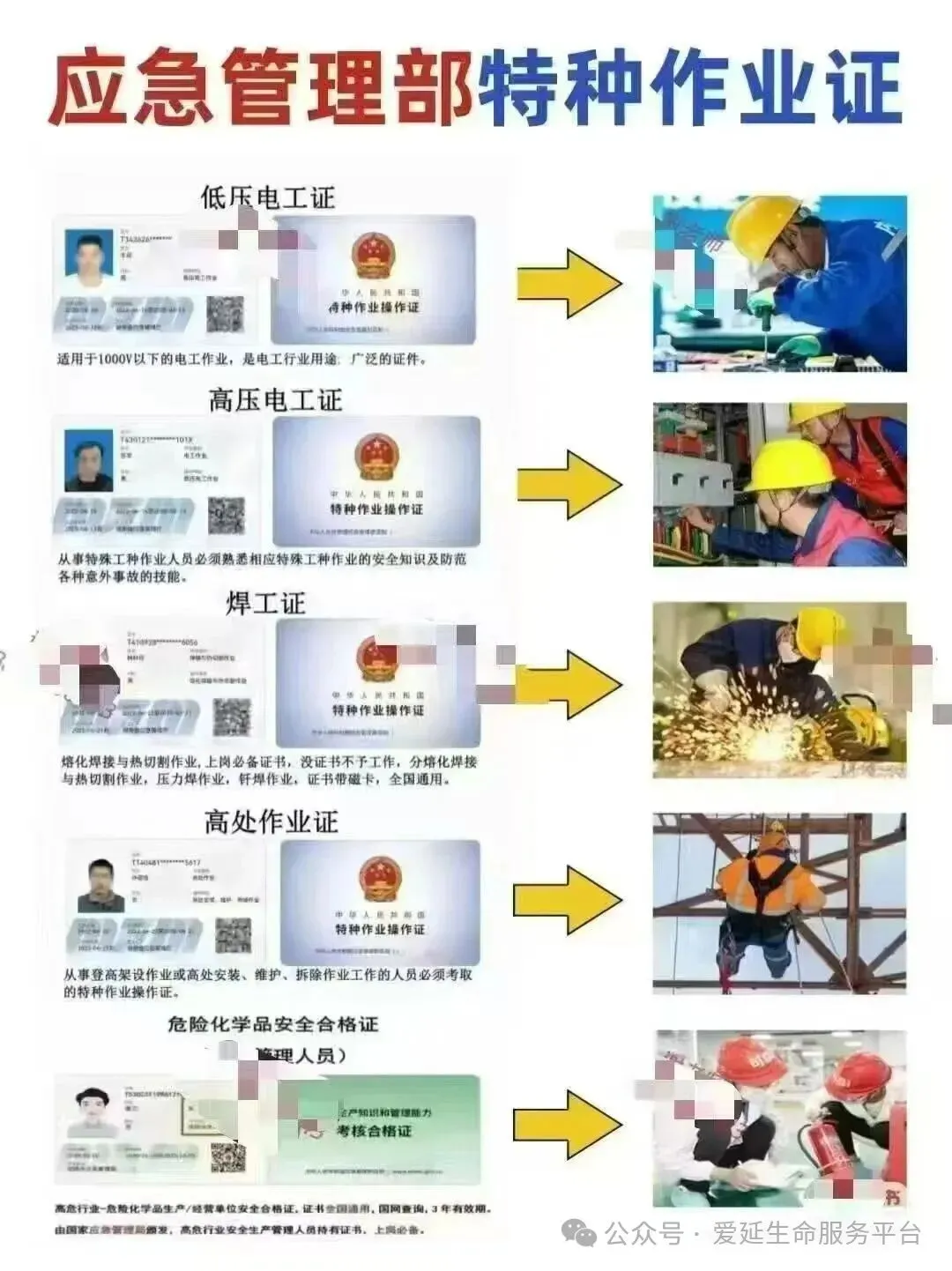 专业类别:低压电工证、高压电工证、焊工证、空调制冷证、登高架设证、高处安装维护拆除作业证等