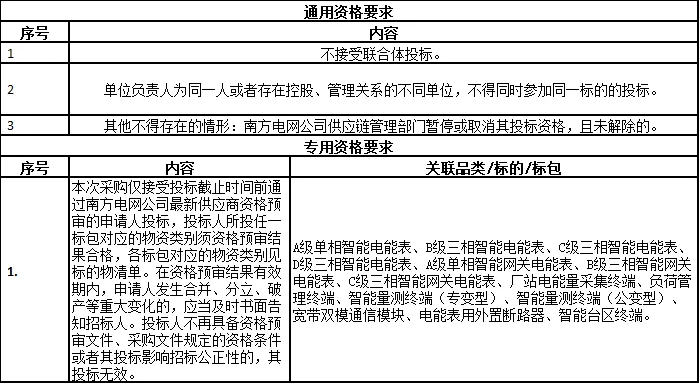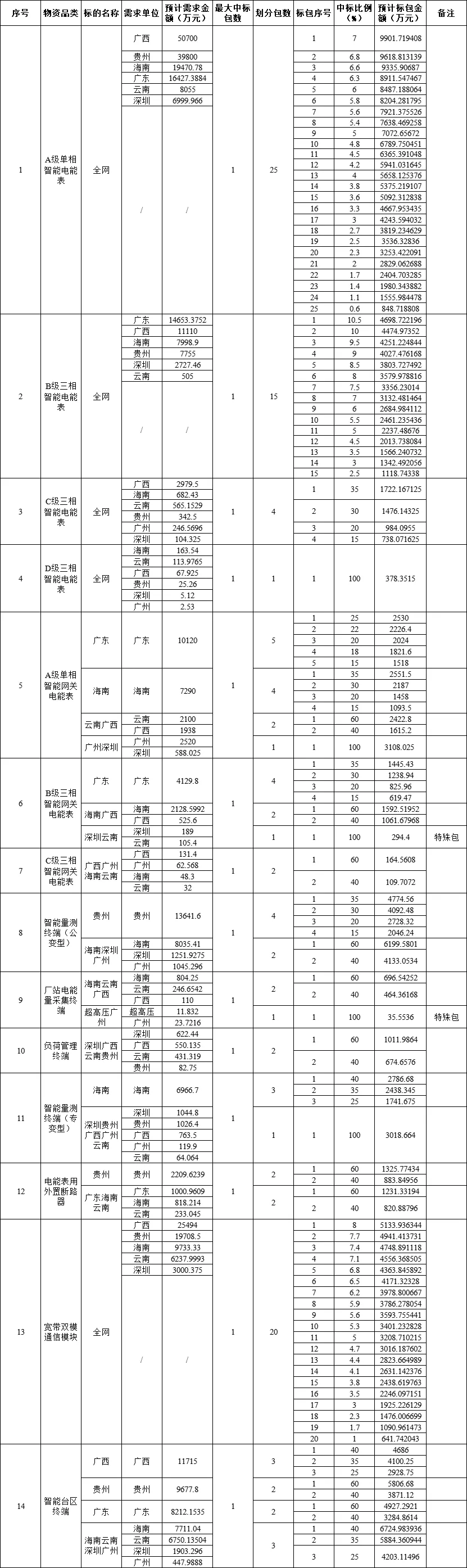 2.2招标范围:本批次框架招标范围包括A级单相智能电能表、B级三相智能电能表、C级三相智能电能表、D级三相智能电能表、A级单相智能网关电能表、B级三相智能网关电能表、C级三相智能网关电能表、厂站电能量采集终端、负荷管理终端、智能量测终端(专变型)、智能量测终端(公变型)、智能台区终端、宽带双模通信模块、电能表用外置断路器共14类物资,需求单位为广东、广西、云南、贵州、海南电网公司,深圳供电局和超高压公司。
