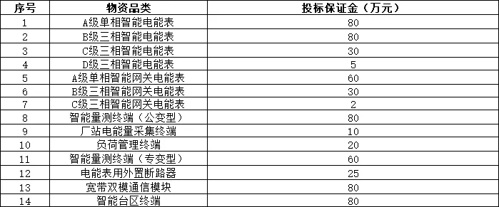 3.本次采购A级单相智能电能表、B级三相智能电能表、C级三相智能电能表、D级三相智能电能表、A级单相智能网关电能表、B级三相智能网关电能表、C级三相智能网关电能表、厂站电能量采集终端、负荷管理终端、智能量测终端(专变型)、智能量测终端(公变型)、智能台区终端共12个品类的报价中均包含RFID电子标签。保证金按物资品类收取,金额见下表: