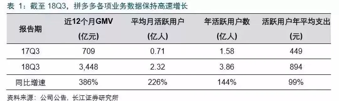 拼多多的经营数据显示,截至2018年三季度近12个月成交总额(GMV)同比增长386% 至 3,448 亿元,平均月活跃用户同比增长 226%至 2.32 亿人,年活跃用户数同比增长 144%至 3.86 亿人,活跃用户年平均支出同比增长 99%至 894 元。