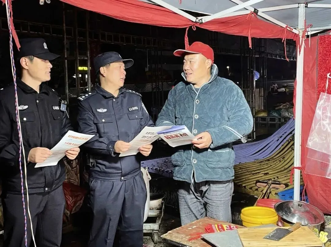 民警们将安全知识打包成一句句贴心、实用的提示,送到每一位摊主和游客手中。