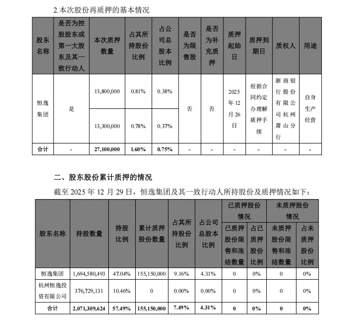 2025年12月29日,恒逸石化发布公告《关于控股股东部分股权解除质押再质押的公告》,控股股东浙江恒逸集团有限公司(以下简称恒逸集团)将其持有的恒逸石化2710.00万股股份进行质押,质押用途为质押贷款,本次质押占其所持股份比例为1.60%,股数占公司总股本比例0.75%。截至目前,恒逸集团合计质押约1.55亿股,按照当天的股票收盘价,恒逸质押的1.55亿股的市值大概是15.5亿。