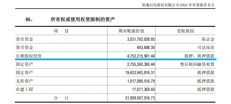 事实上,股权质押融资只是恒逸质押借款的其中一部分,根据2024Q4数据显示,恒逸石化的质押借款就有近133亿,也就说公司为了获得质押借款,质押的资产不仅仅是恒逸集团持有的恒逸石化的股票,因为质押获得的借款一定是明显小于质押资产的价值,质押率通常为50%-75%,按照年报披露的信息来看,恒逸石化高达130多亿长期股权投资也是重要的质押资产,在加上恒逸集团持有,由此计算合计质押资产金额已高达150多亿。