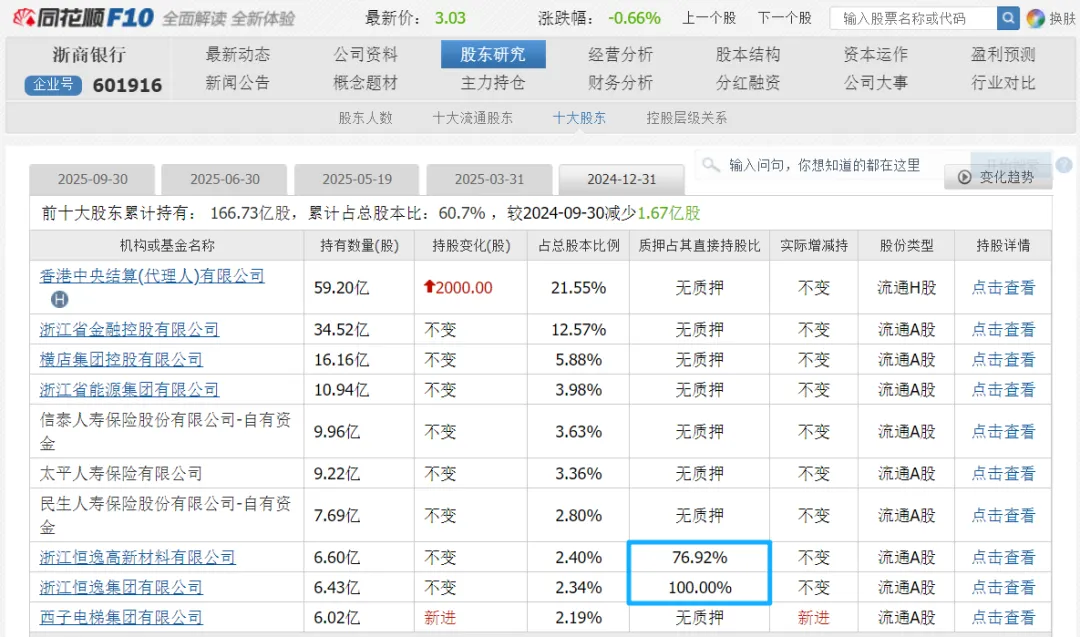 有一点奇怪的是,按照通常质押率最高的75%计算,133亿的质押借款对应的质押资产应该有接近180亿,所以按照2024年年报披露来看似乎还少了一些质押资产,接近30亿的缺口。不过恒逸集团作为浙江商业银行的前十大股东,根据相关信息披露来看,公司在2024Q4就已经质押大部分浙商银行持股,按照当时浙商银行接近2.8元/股的股价来算,恒逸集团合计质押了浙商银行股票大约11.51亿股,市值大约32亿,基本对应了前面的30亿缺口,再加上恒逸集团是浙江商业银行的重要股东,公司股权质押的质权人也是浙江商业银行,所以很有可能浙商银行给恒逸集团的质押率就是按照最高的75%。