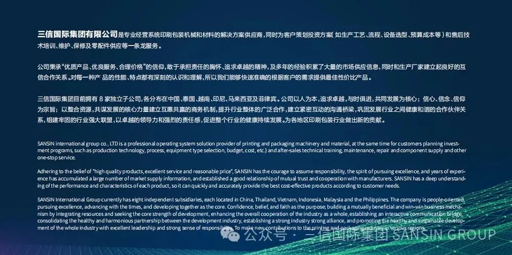 Sansin International Group is a leading sales and service platform for printing equipment and consumables in Southeast Asia. It has been dedicated to establishing a cooperation platform between high-quality printing equipment manufacturers in China and customers in Southeast Asia, and promoting the upgrading of the regional printing industry.