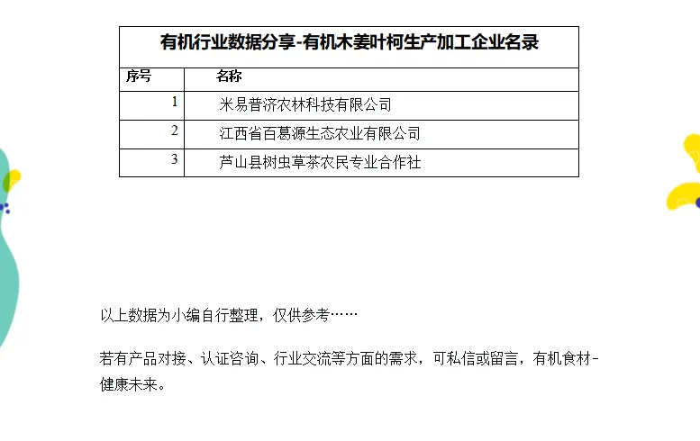 木姜叶柯,正处在从野生到人工的产业化初期,多地开始规模化种植,产品以“甜茶”或“瑶茶”进入市场,正开发更多深加工产品。以原叶茶、颗粒茶为主,并作为药食同源原料向食品、保健品领域延伸,其富含黄酮类物质,被赋予“树上虫草”的保健概念。产地集中在江西德兴、湖南溆浦、浙江湖州、湖南汨罗等地。目前,经过中国有机认证的木姜叶柯生产加工企业共有3家,具体如下: