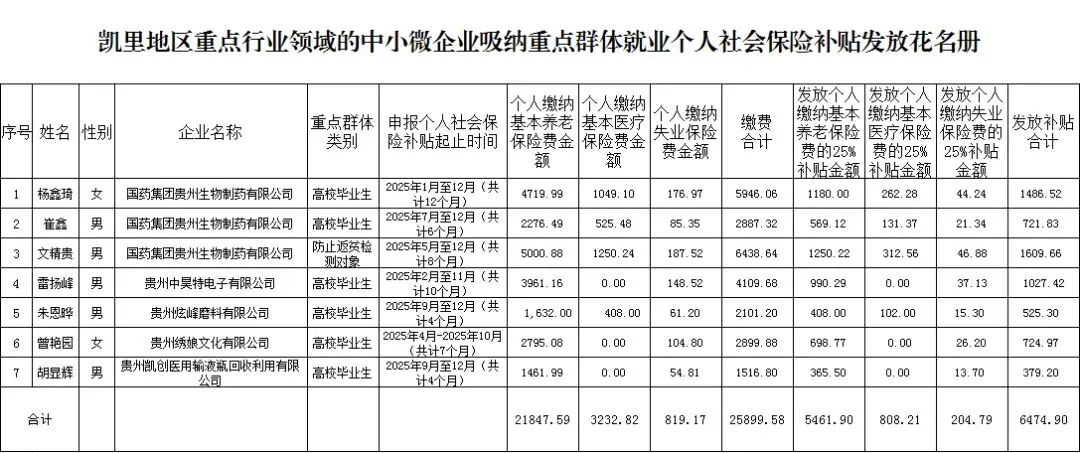 根据《省人力资源社会保障厅等十四部门关于印发〈进一步稳定和扩大就业若干措施〉的通知》(黔人社发〔2025〕11号)要求,现有凯里地区重点行业领域的中小微企业申报吸纳重点群体就业个人社会保险补贴共5家7人,经对其申报材料进行审核,均符合发放条件,发放金额6474.90元。现予以公示(公示时间:2026年1月5日至2026年1月9日),公示期间如有异议请向凯里市人力资源和社会保障局反映。