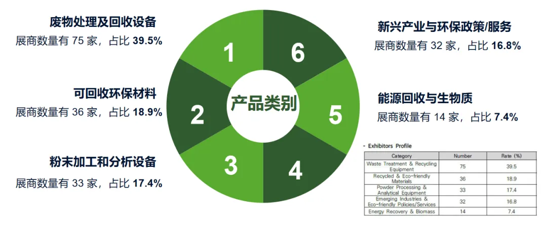 贸易属性突出:参展商以废物处理及回收设备企业(39.5%)、可回收环保材料企业(18.9%)、粉末加工分析设备企业(17.4%)为主,商务对接效率高