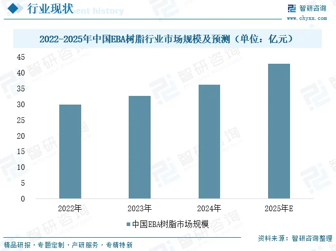 EBA树脂作为高性能胶粘剂与改性塑料的核心基础材料,凭借其优异的柔韧性、强粘附性、耐低温特性及环保优势,在汽车制造、新能源电池封装、电子电器、光伏组件等关键领域发挥着不可替代的作用。近年来,在环保政策推动与新能源产业高速发展的双重驱动下,行业持续向低VOC、生物基等绿色方向突破,市场规模稳步增长,2024年行业市场规模约36.1亿元,预计2025年将进一步提升至42.8亿元,其中胶粘剂与塑料改性构成核心基本盘,而新能源应用正成为拉动行业增长的关键引擎。