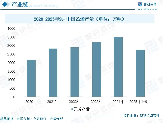 EBA树脂产业链的上游核心原材料为乙烯与丙烯酸丁酯。乙烯作为重要的石油化工基础原料,其全球与中国市场供应整体呈现稳步增长态势。中国已成为全球主要的乙烯生产区,近年来产能持续扩张,随着裕龙岛炼化一体化等大型项目的陆续落地,区域供给能力得到进一步强化。数据显示,我国乙烯产量从2020年的2160万吨增长至2024年的3493.4万吨,年复合增长率达12.77%;2025年1-9月,行业产量已达2739.9万吨,同比增长7%。