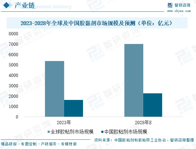 EBA树脂凭借其高粘结性和强相容性,已成为粘合剂领域的核心材料之一,尤其在对PE、PP等难粘材料表现卓越,固化后柔韧度高,是高性能热熔胶的关键基料,广泛用于书刊装订、木材封边、纸尿裤腰贴等日用场景,以及汽车内饰粘结、电子元件密封等工业领域,并适应-30℃至70℃的宽温环境。据中国胶粘剂和胶粘带工业协会数据,2023年全球胶粘剂市场规模约为700–800亿美元,年均增长率约4%–6%;中国市场规模约1500–1700亿元,增速显著高于全球,预计达6%–8%,至2028年全球有望突破1000亿美元,中国市场或达2000–2500亿元,为EBA树脂行业持续提供广阔需求空间。