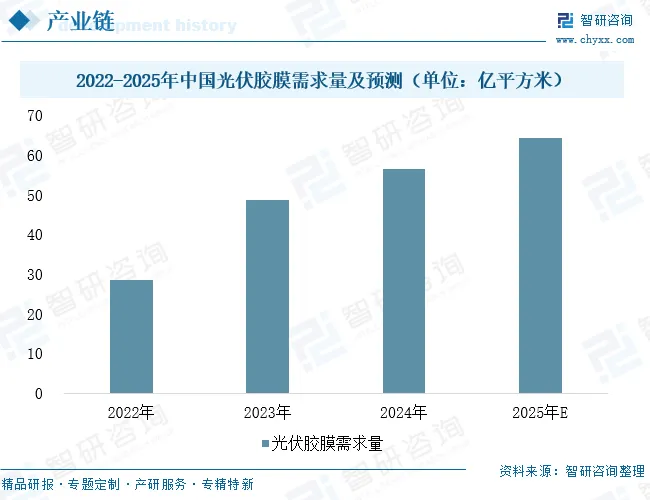 在光伏领域,EBA树脂被应用于光伏组件封装胶膜,有效提升胶膜的粘结强度与耐候性能,为组件长期可靠性提供关键材料支持。随着我国光伏产业快速发展,封装胶膜需求持续攀升。数据显示,2022至2024年间,中国太阳能电池封装胶膜需求量从28.5亿平方米迅速增长至56.48亿平方米,年复合增长率超过40%,预计2025年整体需求量将突破60亿平方米。这一强劲增长态势,为EBA树脂在新能源材料领域带来持续且广阔的市场空间。