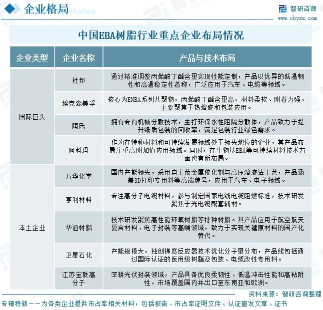 中国EBA树脂行业已形成“国际主导、本土跟进”的竞争格局,以埃克森美孚、陶氏、阿科玛为代表的国际巨头凭借技术和产品优势主导高端市场,而本土企业正积极在细分领域寻求突破。全行业围绕丙烯酸丁酯(BA)含量的精准调控展开产品差异化竞争,开发不同BA含量的专用牌号,以满足包装、粘合剂、电线电缆等多元需求。当前技术布局正加速向生物基EBA等绿色方向升级,并聚焦新能源、电子封装等高附加值新兴应用。