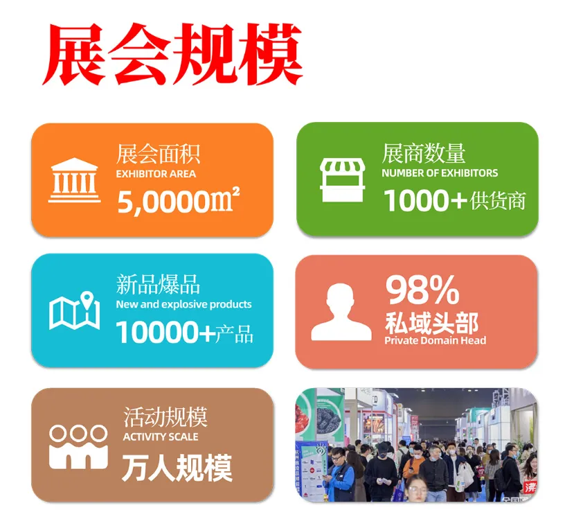 展会规模宏大,面积达 50000㎡,汇聚 1000 + 供货商,展出 10000 + 新品爆品,吸引 98% 私域头部参与,活动规模超万人。