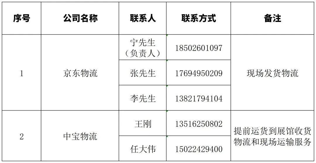 本届展会指定物流公司为国家会展中心(天津)展馆驻场物流公司:京东、中宝馆内服务网点(见下图)
