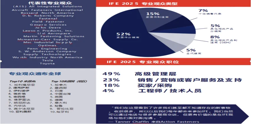 美国紧固件展(International Fastener Expo)是北美地区规模最大且最具专业性的紧固件行业展会,致力于为全球紧固件及其相关产业提供一个全面的B2B交流平台。展会每年吸引着来自世界各地的供应商、制造商、经销商和分销商,他们通过这个平台建立起紧密的业务关系,促进跨国合作与技术交流。在这个展览会上,参展商不仅可以展示最新的紧固件产品和相关设备,还能够与行业的领先企业建立长期的合作伙伴关系。