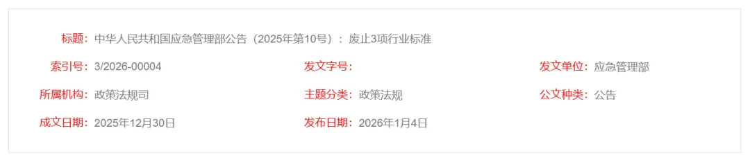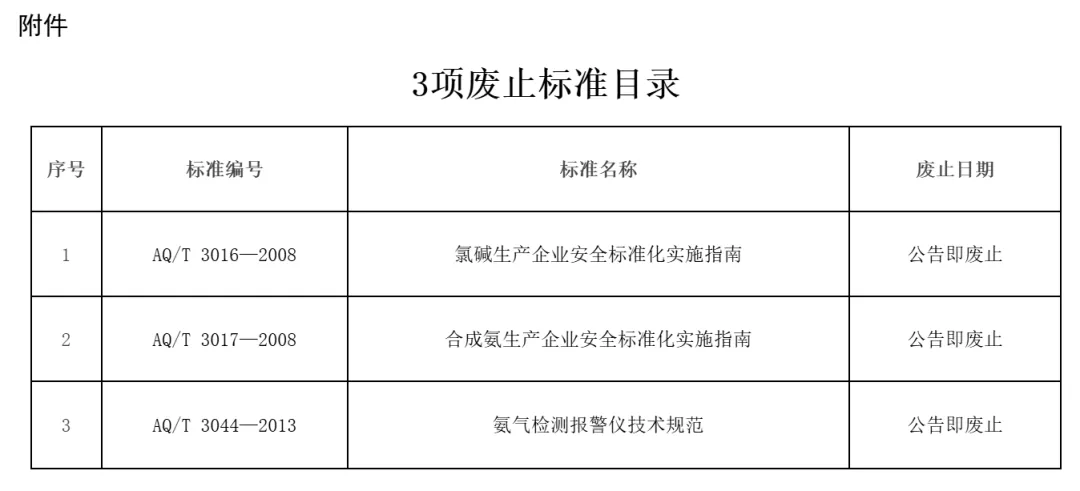 中华人民共和国应急管理部废止《氯碱生产企业安全标准化实施指南》等3项行业标准,现予公告。
