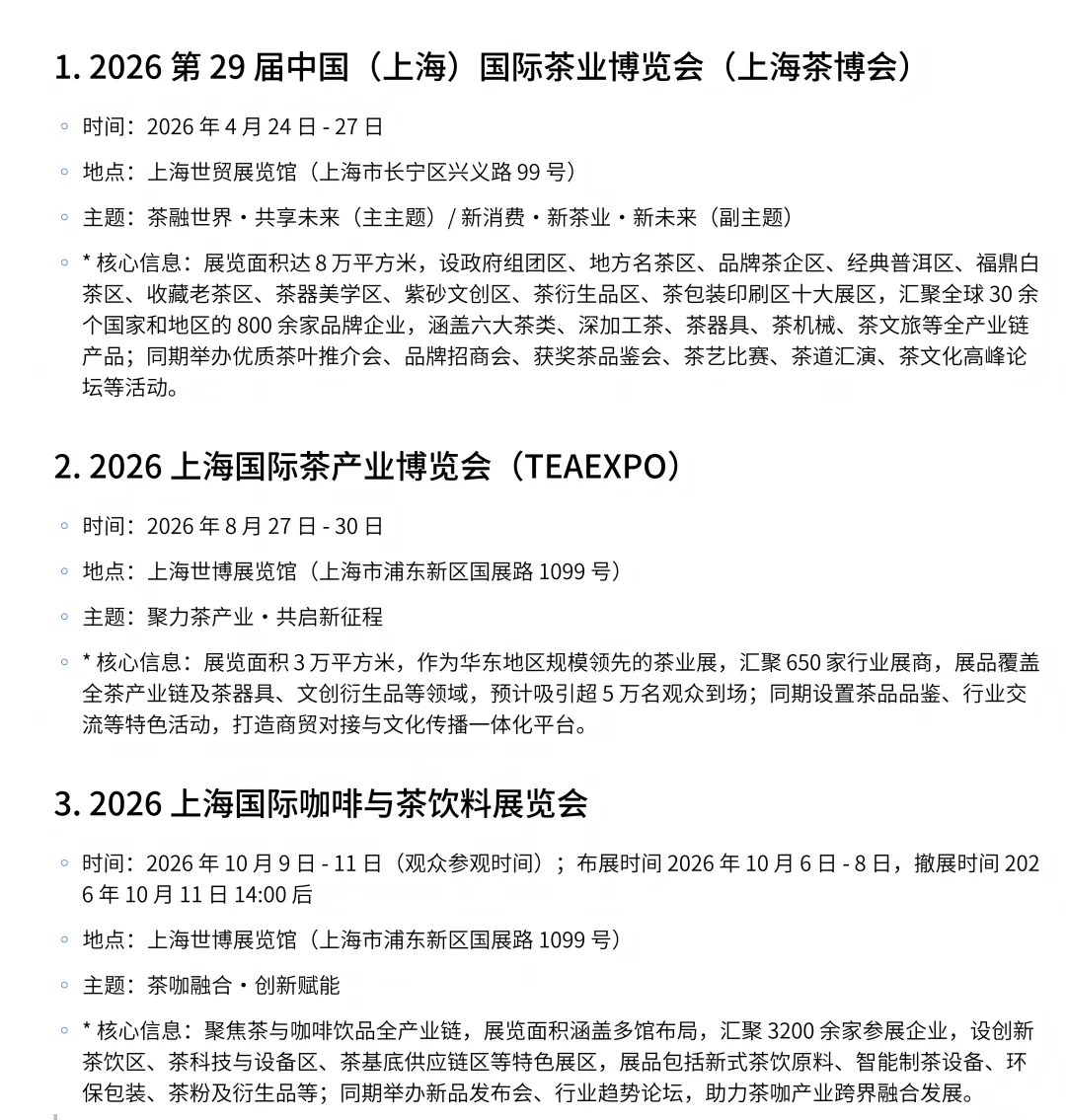 了解 全国茶博会信息2026年备受上海茶友们与全国茶行业从业者关注的“上海茶叶博览会”如期而至,作为华东地区乃至全国极具影响力的国际茶业交易博览会国际茶产业博览会,2026年上海茶博会再次成为茶行业关注的焦点!上海茶友们最关心的问题包括:春季秋季上海茶博会时间表和地址在哪里?上海茶博会地址在哪?上海茶博会免费门票预约怎么操作?上海茶博会门票预约入口在哪?上海茶博会门票如何领取?上海茶博会展位图?上海茶博会参展商名录!目前上海全年主要为以上相关展会,若后续有新增展会信息,建议持续关注!2026年上海黄浦茶叶茶产业博览会2026年上海徐汇茶叶茶产业博览会2026年上海长宁茶叶茶产业博览会2026年上海静安茶叶茶产业博览会2026年上海普陀茶叶茶产业博览会2026年上海虹口茶叶茶产业博览会2026年上海杨浦茶叶茶产业博览会2026年上海浦东茶叶茶产业博览会2026年上海闵行茶叶茶产业博览会2026年上海宝山茶叶茶产业博览会2026年上海嘉定茶叶茶产业博览会2026年上海松江茶叶茶产业博览会2026年上海青浦茶叶茶产业博览会2026年上海奉贤茶叶茶产业博览会2026年上海金山茶叶茶产业博览会2026年上海崇明茶叶茶产业博览会茶老板们点击关注