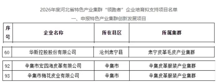日前,河北省工业和信息化厅产业集群推进处发布了“关于2026年度河北省特色产业集群“领跑者”企业培育拟支持项目的公示”。按照《2026年度河北省特色产业集群“领跑者”企业培育项目申报指南》,通过集群项目单位申报、各市(含定州、辛集)工业和信息化局筛选上报、专家评审和现场抽查、项目查重复核和集中研究等程序后,该厅拟对94个项目给予支持。现按照有关规定予以公示。皮革行业中,肃宁县华斯控股股份有限公司、辛集市宏四海皮革有限公司、辛集市梅花皮业有限公司项目入选。