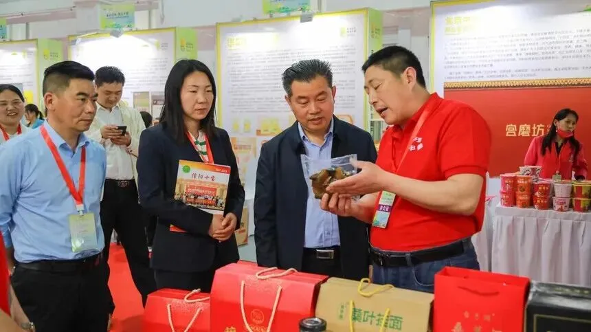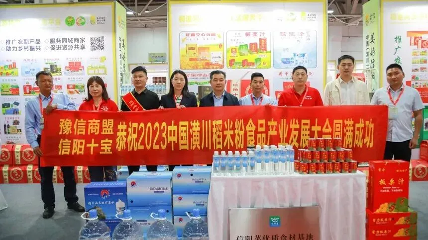 与此同时,在“美好信阳·稻香中国”2023中国(潢川)稻米粉食品产业发展大会上,安井食品、旺鑫空心贡面、蜜力板栗汁、报晓峰鸡公山矿泉水、何家冲山茶油、亿仙园橡子粉丝、荷甲源卤甲鱼、台子湖桑葚酒、栗康元板栗酒等信阳十宝联盟企业的展台里,前来品尝和洽谈的顾客络绎不绝,对推介的产品驻足打卡。