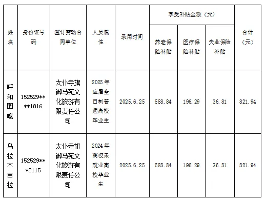根据内蒙古自治区人力资源和社会保障厅、财政厅《关于转发人力资源社会保障部办公厅财政部办公厅加快落实扩大社会保险补贴范围政策有关工作的通知》(内人社办函﹝2025﹞118号)、《人力资源社会保障部办公厅 财政部办公厅 关于加快落实扩大社会保险补贴范围政策有关工作的通知》(人社厅函﹝2025﹞129号)文件要求,经太仆寺旗御马苑文化旅游有限责任公司申请,太仆寺旗就业服务中心审核,现将拟发放重点行业领域中小微企业吸纳重点群体人员社会保险补贴名单进行公示,公示期间接受社会各界监督。