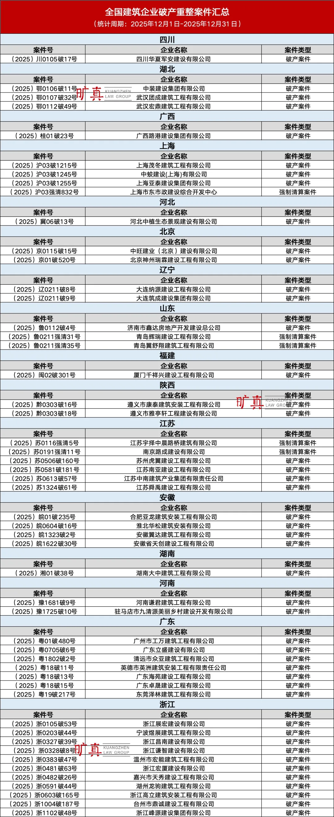 行业前沿|12月全国建筑企业破产重整案件汇总