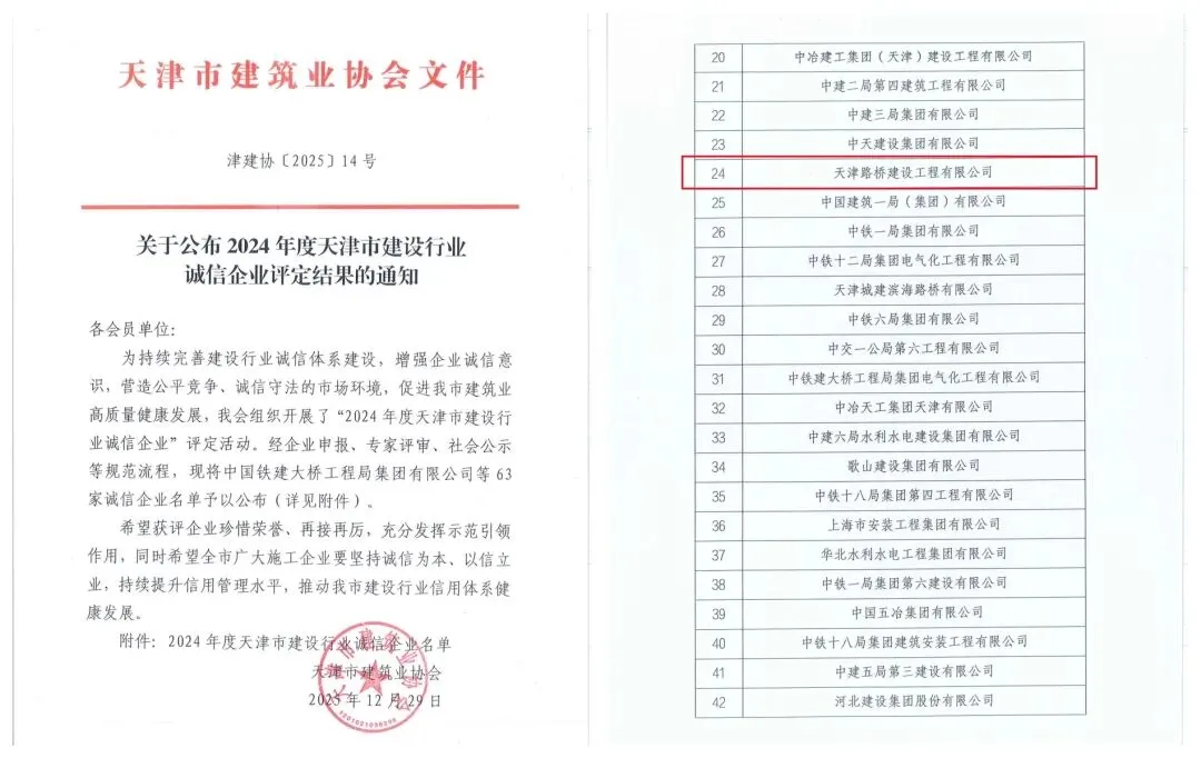 近日,天津市建筑业协会正式发布了“2024年度天津市建设行业诚信企业及诚信项目经理”评定结果。天津路桥建设工程有限公司凭借稳健的经营管理、过硬的工程品质与深厚的诚信积淀,成功入选“2024年度天津市建设行业诚信企业”行列,这已是公司自参评以来第15次荣获此项重要荣誉。