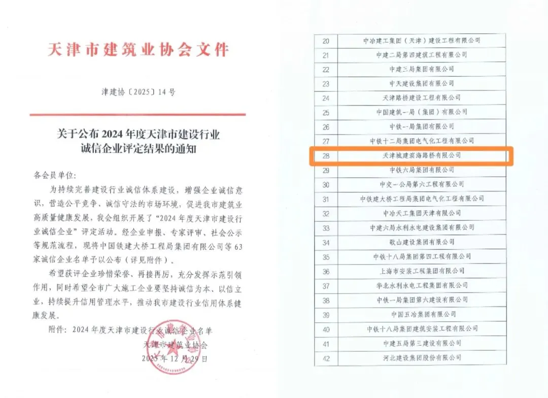 近日,滨海路桥公司凭借在工程建设领域的诚信经营理念与卓越工作表现,获得“2024年度天津市建设行业诚信企业”称号。此项荣誉既是对公司多年恪守行规、重诺守信的高度认可,也是彰显公司在持续深化综合竞争力方面取得扎实成效的重要体现。