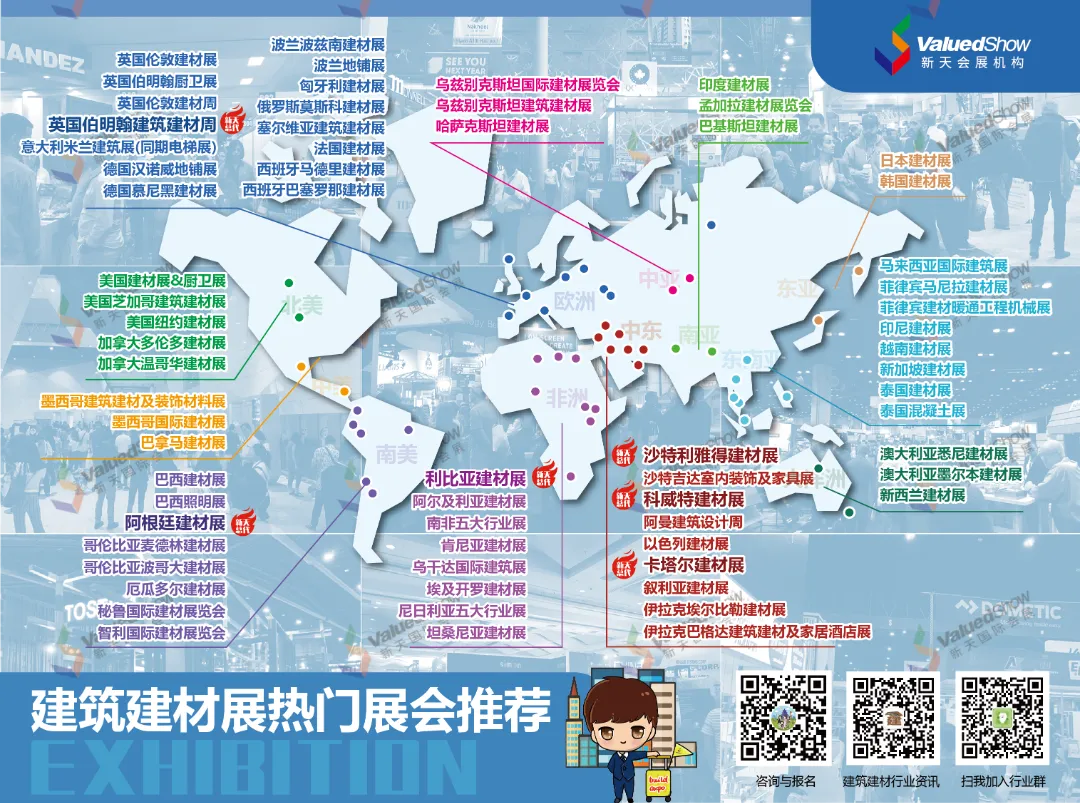 为直观呈现2026年全球建筑建材热门展会的区域分布,新天会展特为您制作建筑建材及五金热门展会推荐地图,帮助企业快速掌握全球展会布局,精准定位目标市场~