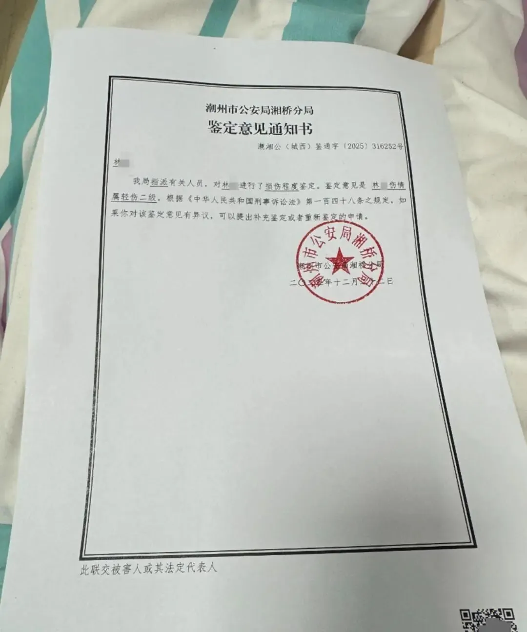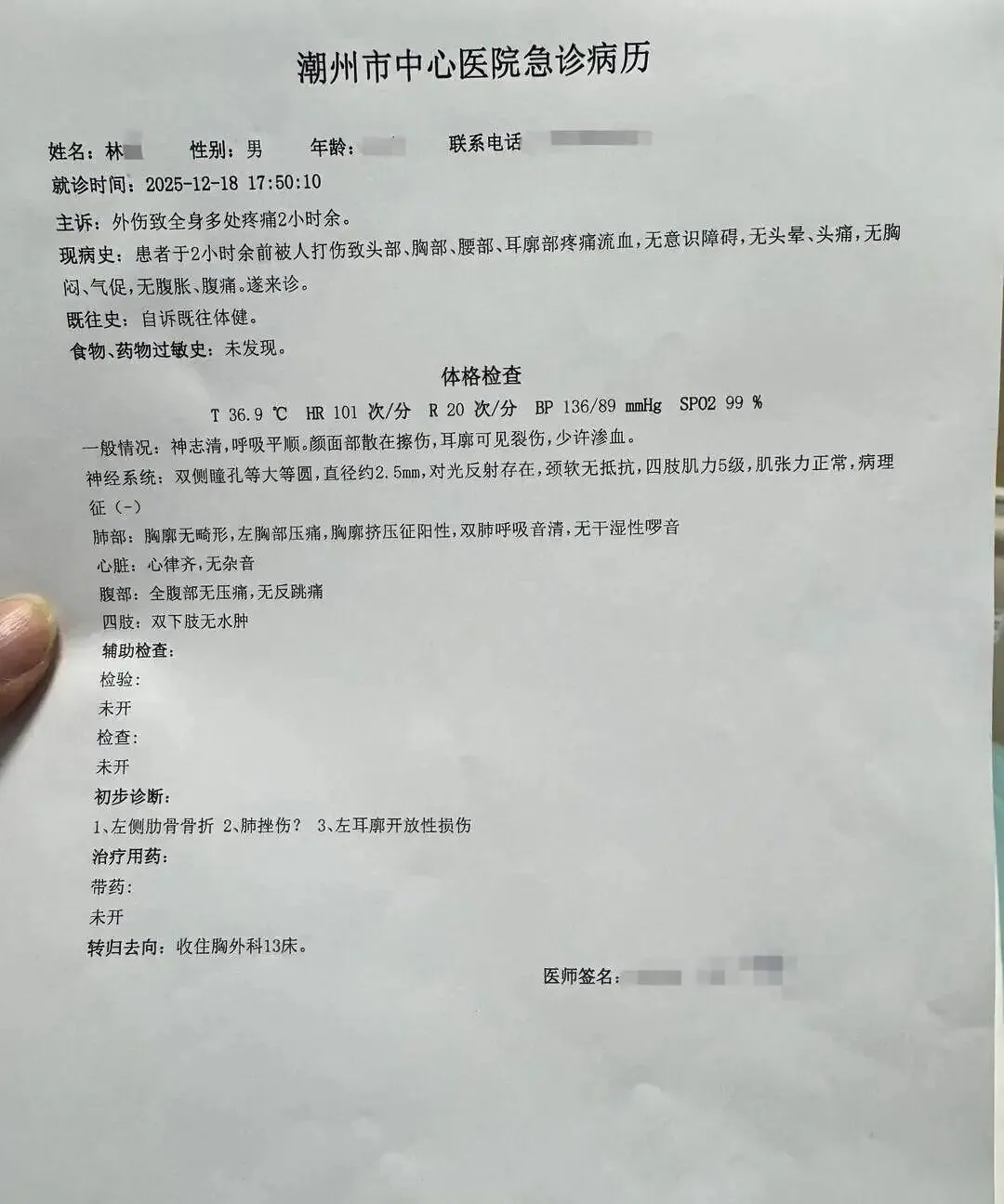 医院的急诊报告显示,林先生左侧肋骨骨折、肺部挫伤以及耳廓开放性损伤,伤情最终被评定为轻伤二级。潮州市公安随即立案侦查,以寻衅滋事罪予以受理。对于损伤鉴定结论,林先生没有异议,仅希望相关部门严格依法处理。在此之后,记者数次联系当地市场监督局,得到的回复均是需要进一步请示,高层一直未有明确回应。
