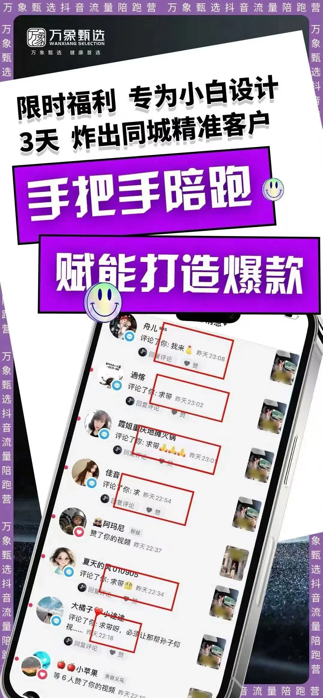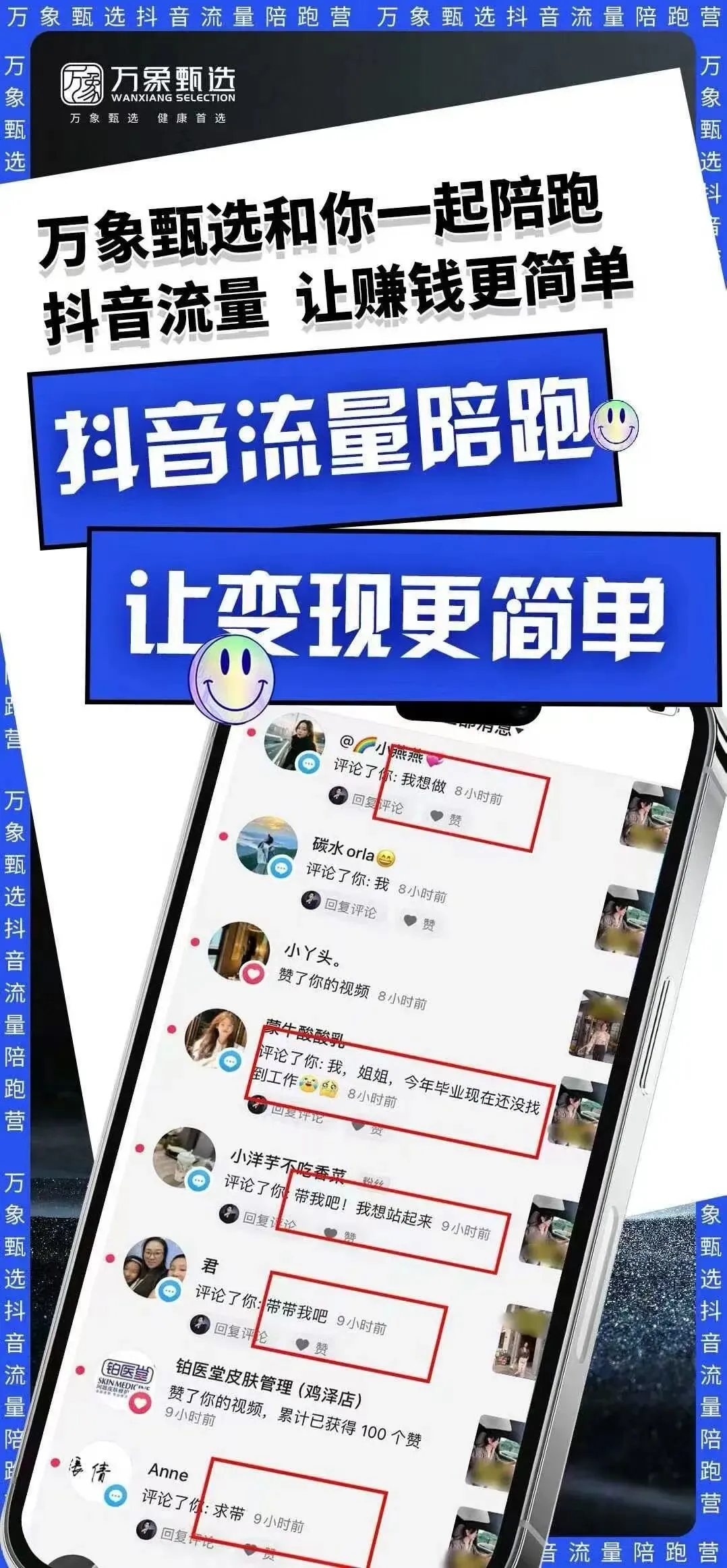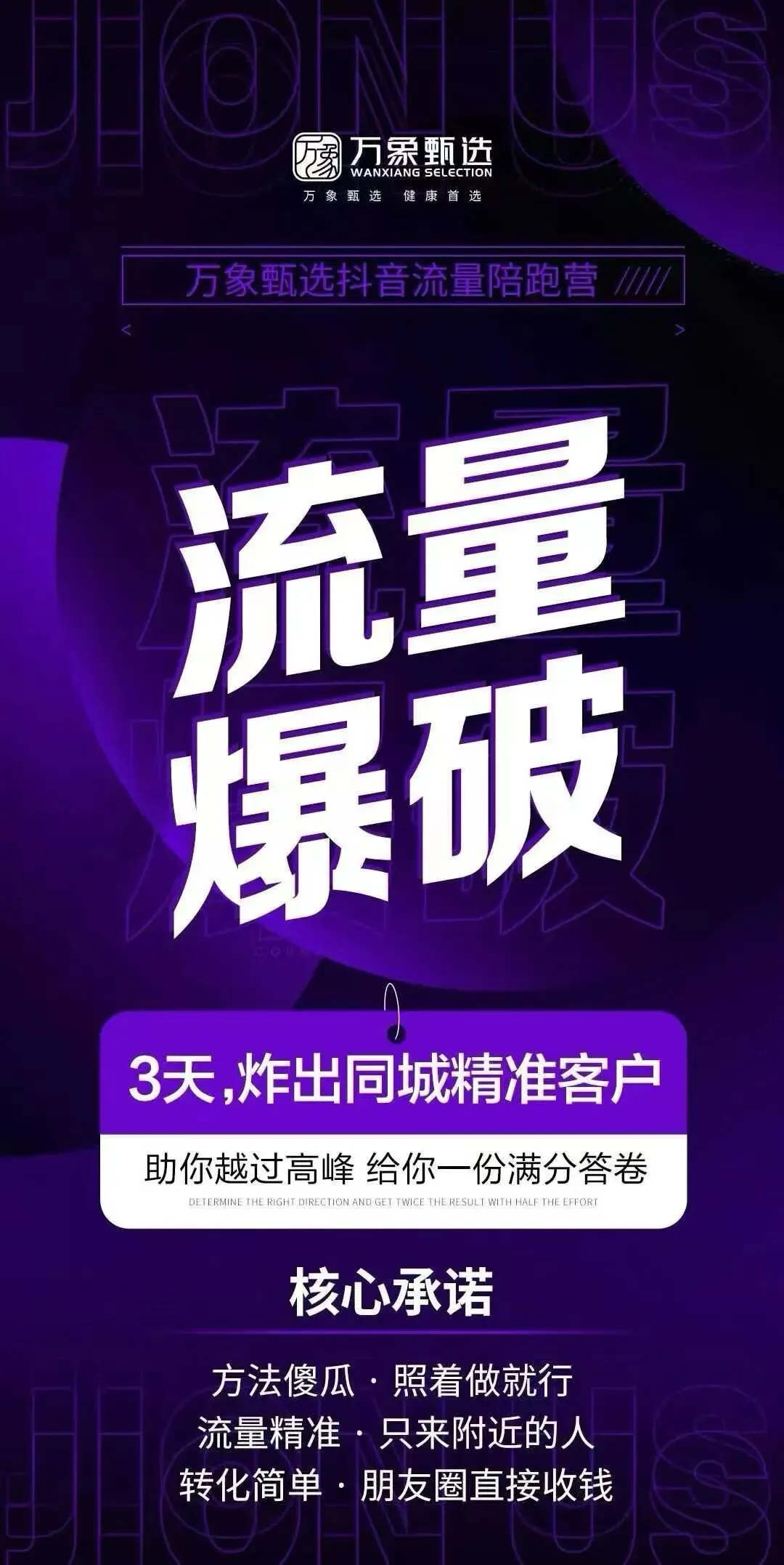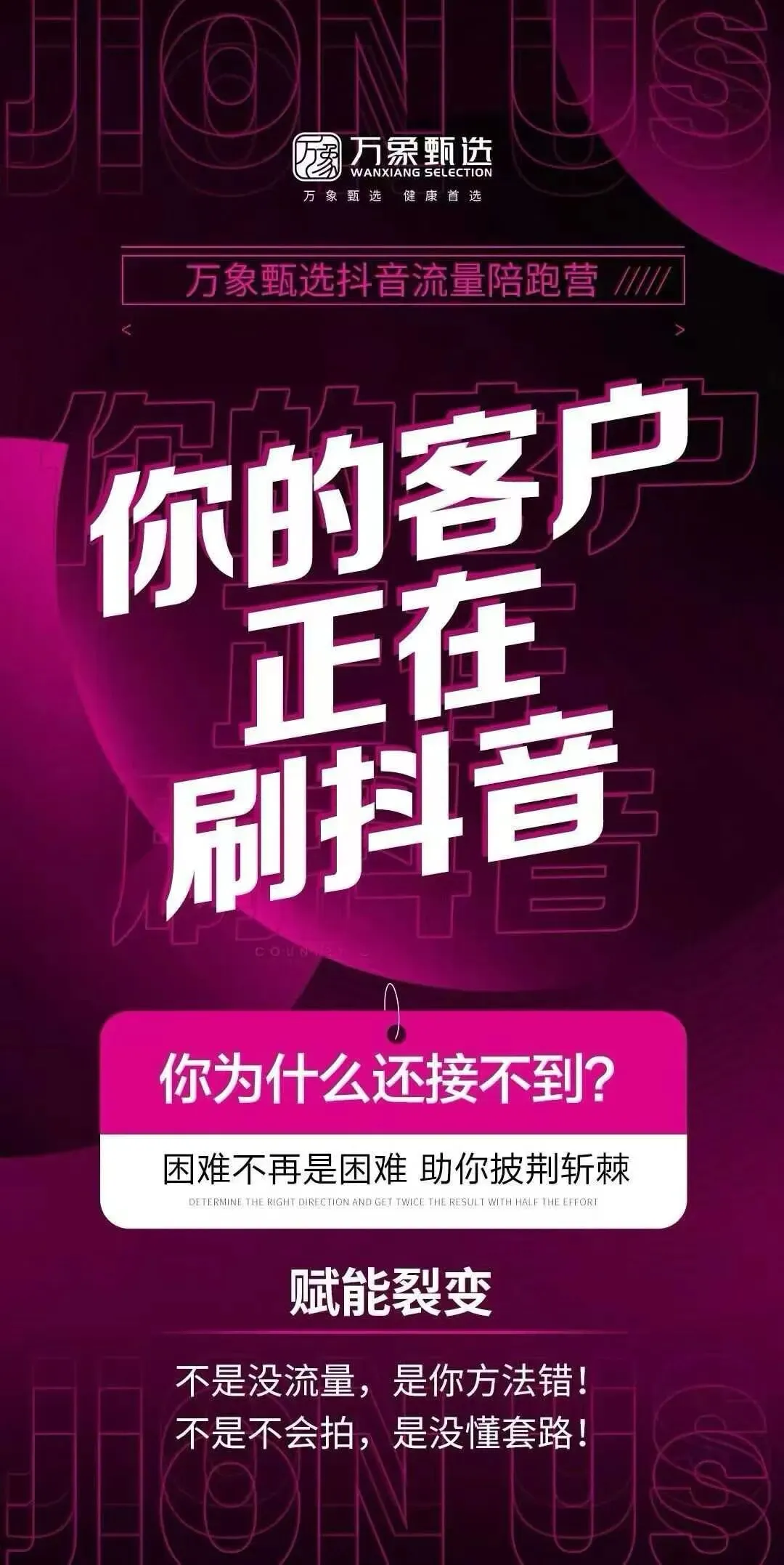 更关键的是,万象甄选直击传统微商痛点:不用死磕朋友圈,不用依赖有限人脉,而是带你抢占抖音亿级流量池。