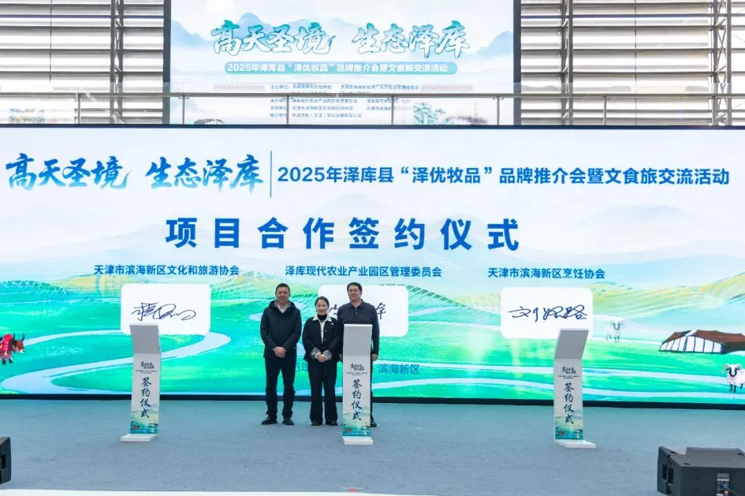 在推介会上,举行了意义非凡的“品牌推介官”聘任仪式和战略签约仪式。援青电影《小乔的夏天》出品人热情推介了泽库的独特文旅资源和特色产品。泽库县文体旅游广电局与中滨文投(天津)文化发展有限公司就文旅开发达成战略合作;泽库现代农业产业园区管理委员会与天津市滨海新区文化和旅游协会签署商业合作协议,尝试在文食旅产业领域开发创新;泽库牧源农牧科技有限公司与天津津海家宴餐饮有限公司搭建长期产销对接桥梁。这一系列签约,标志着两地对口支援工作从单向帮扶向双向共赢、深度融合迈出了实质性步伐,为泽库特色产品稳定进入天津及更广阔市场铺设了高效通道。