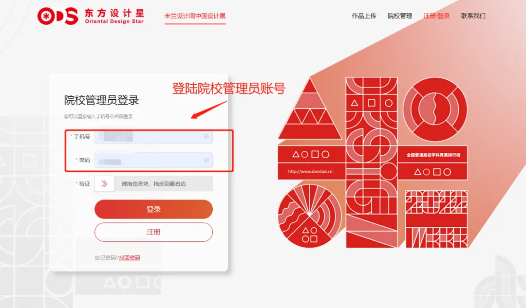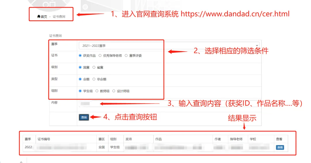 1、登录赛事官网(www.dandad.cn)——进入院校报名入口2、登录院校管理员账号(以院校为单位申请注册的账号)03 官网查询、查验证书