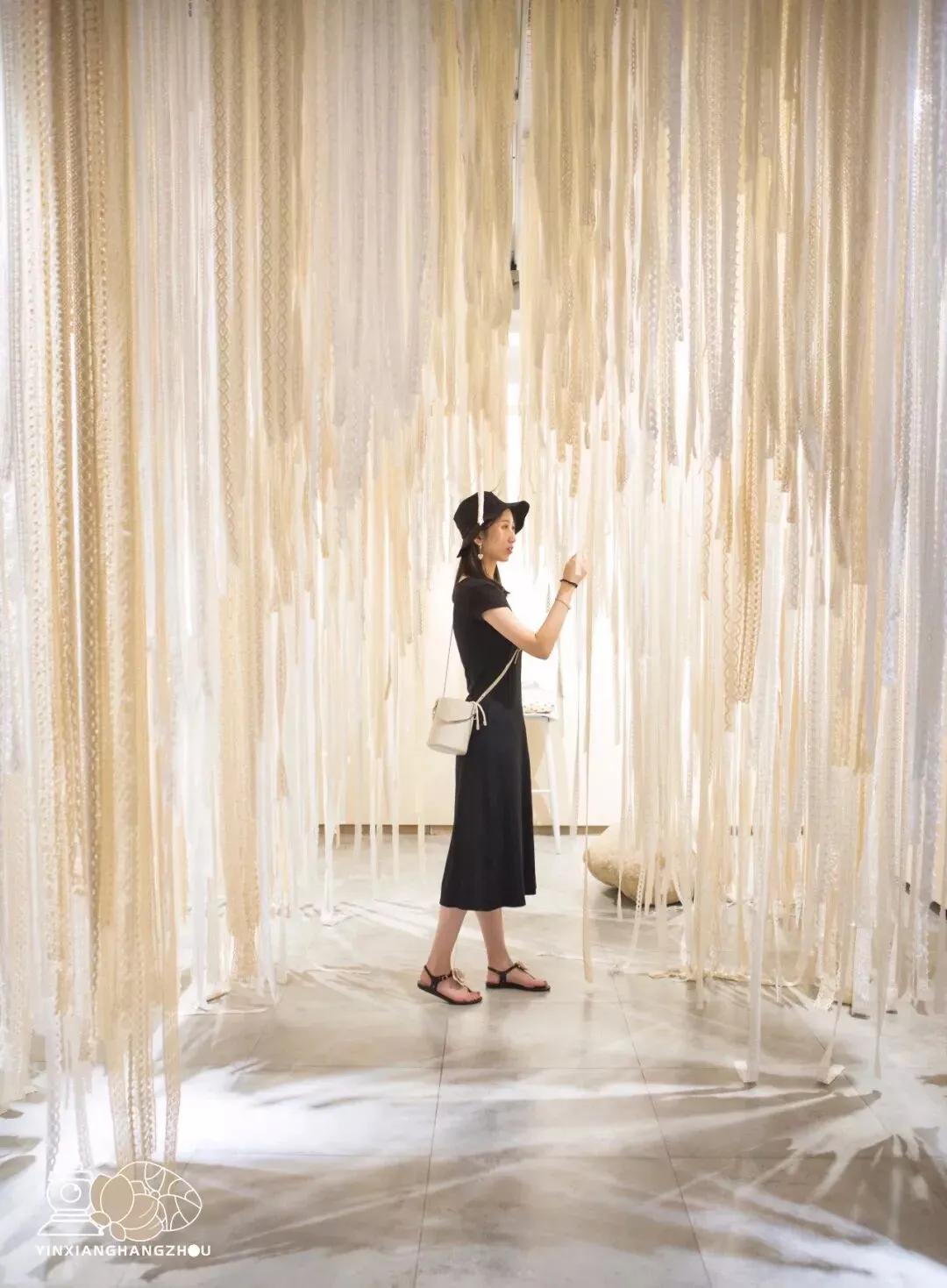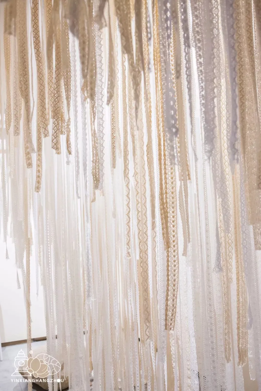 而隔壁便是一片浪漫的“蕾丝瀑布”,展区原意是想观者身处其中一根根拆除蕾丝,更深入了解蕾丝的制作。但是显然这一片瀑布般的壮观景观,拍拍拍似乎更引人流连。