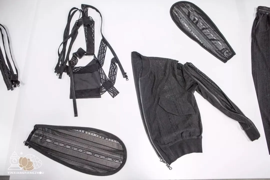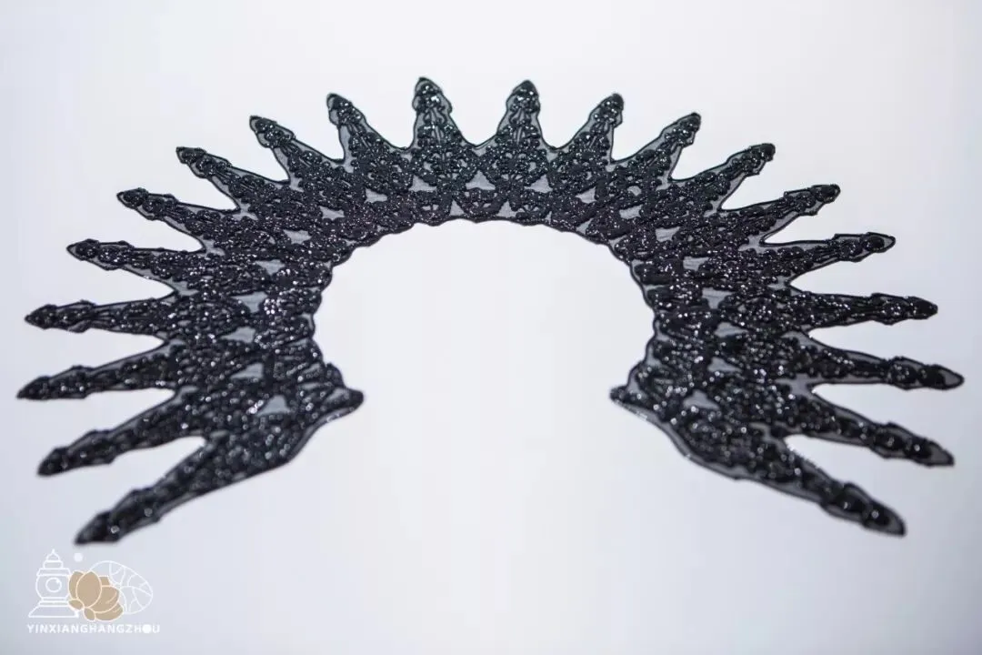 运用先进的3D打印技术,将蕾丝三代发展历史浓缩在三块截然不同的硅胶蕾丝上。第一块的需要面料作为底布的蕾丝样品,第二块和网状纱布结合织造,而第三块则是直接打印,无需面料作为底布的高度。