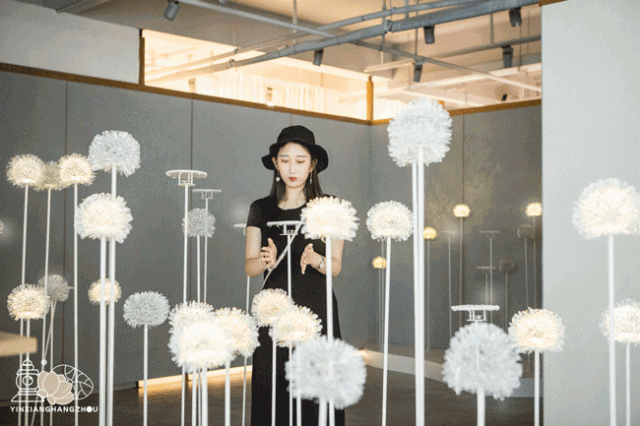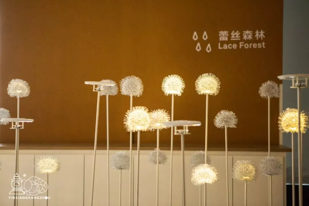 这可是全场最梦幻的一处了,森林里分为蒲公英区和冥想区,在蒲公英丛中有蕾丝结晶灯,用盐在蕾丝表面结晶形成肌理,双手合并拍打灯杆,就能唤醒点亮结晶,从上俯视还能看见无数变化的蕾丝图案。