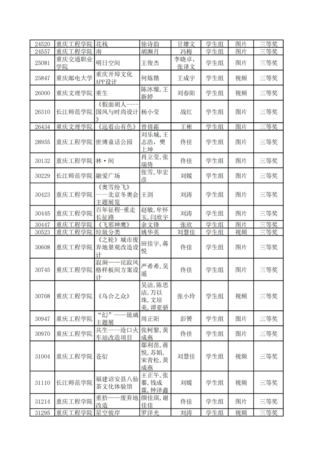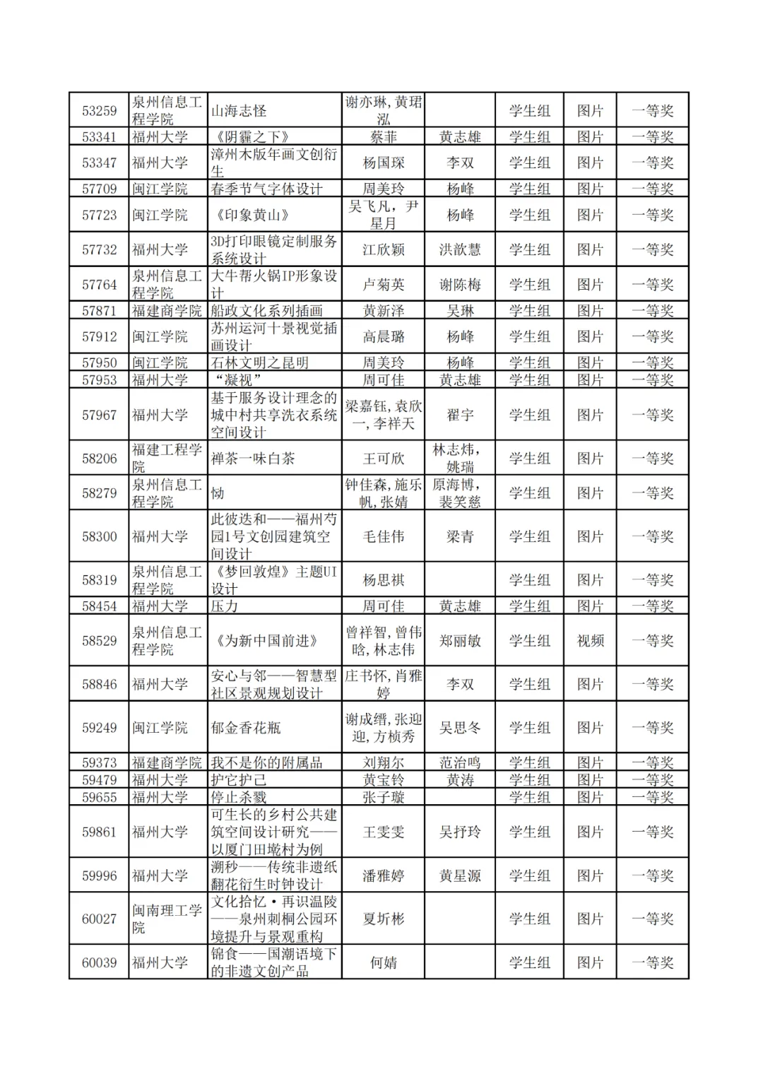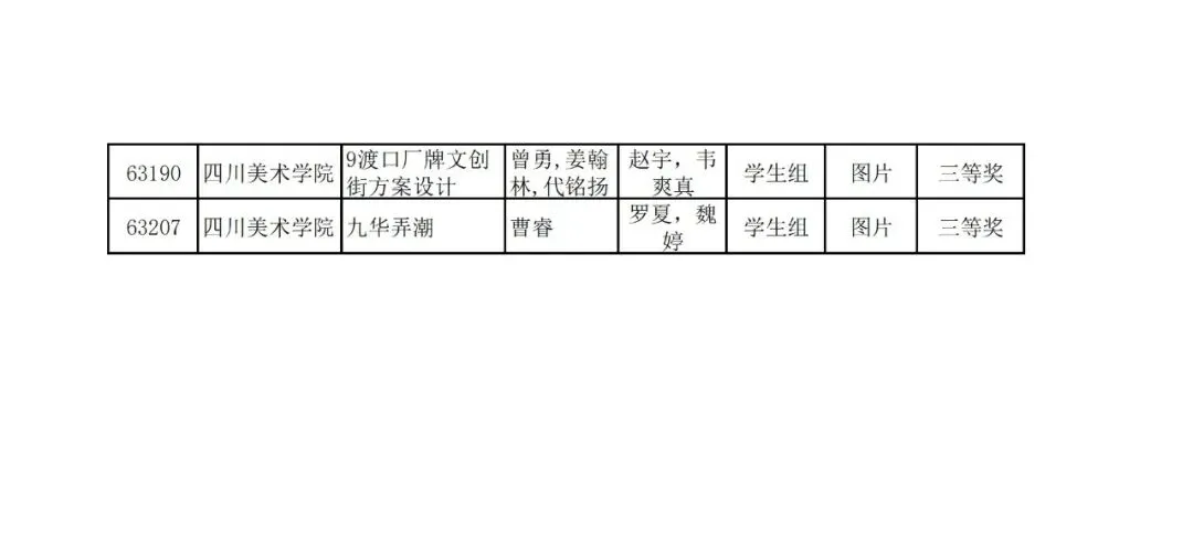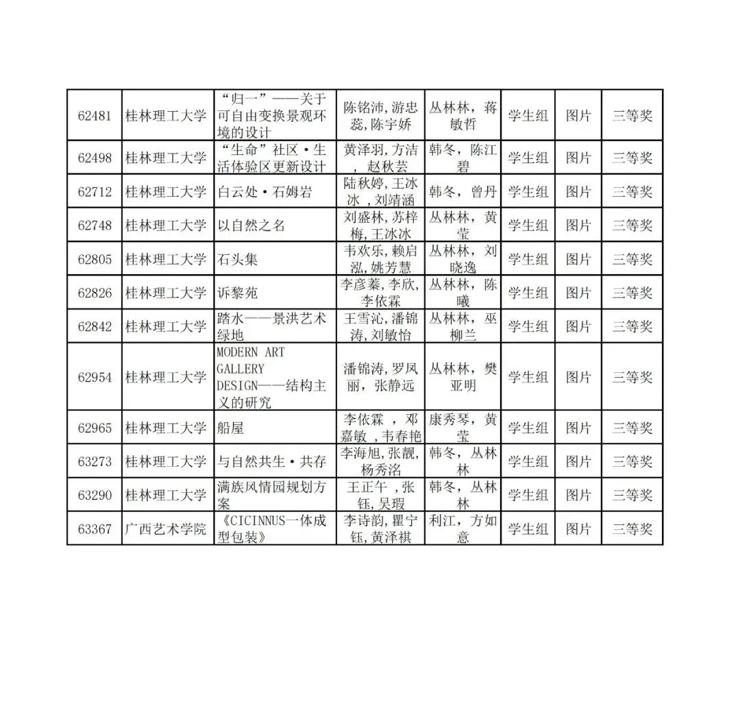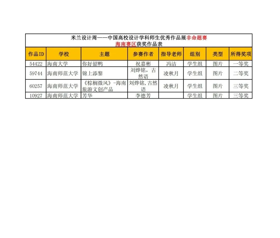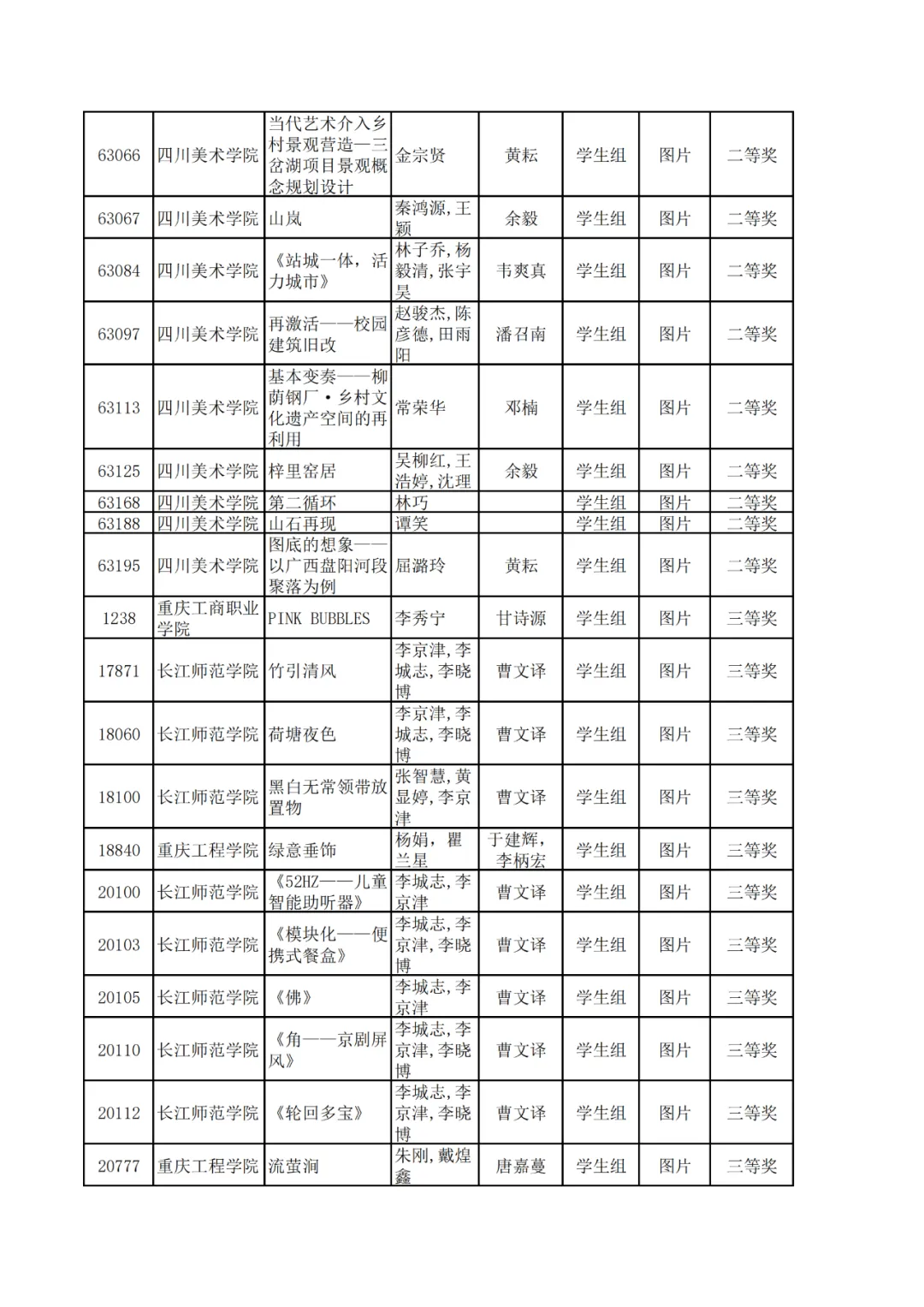学生组获奖作品表。