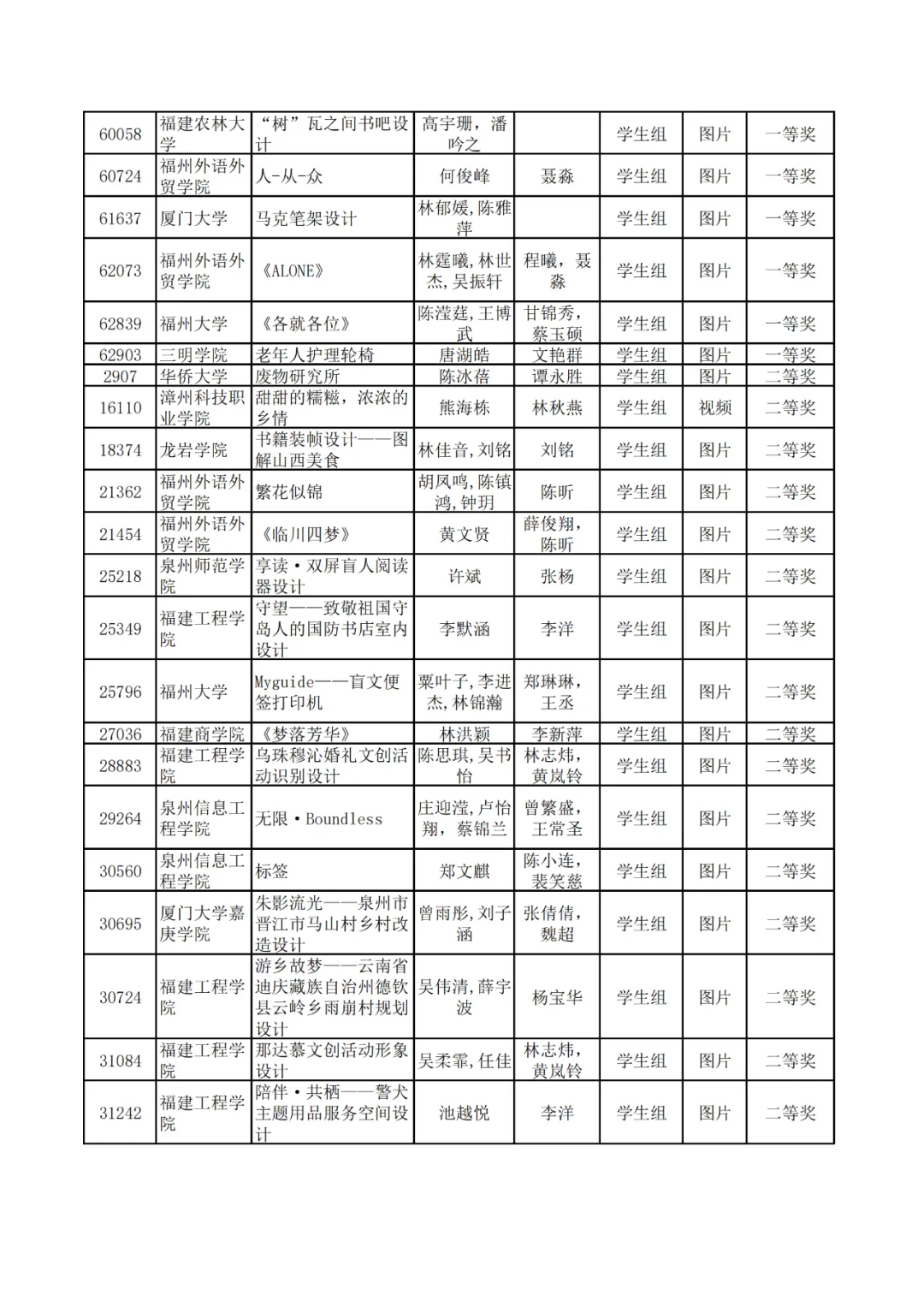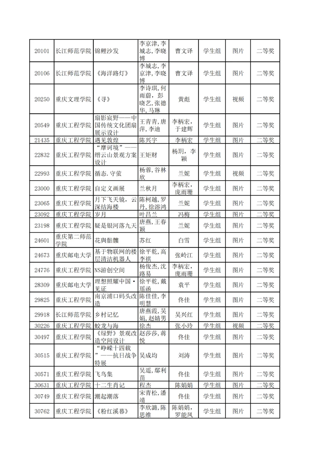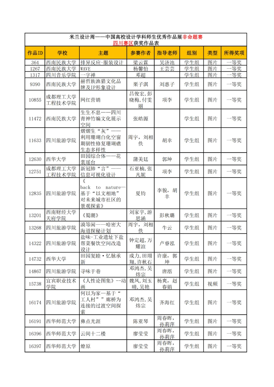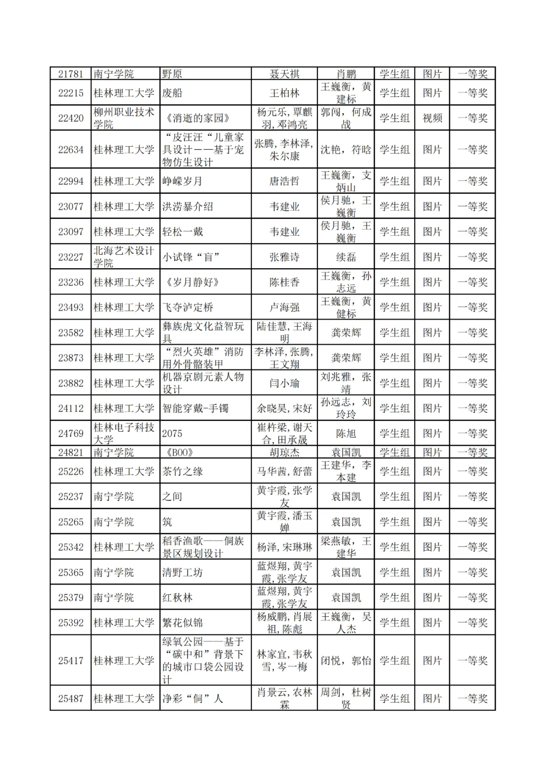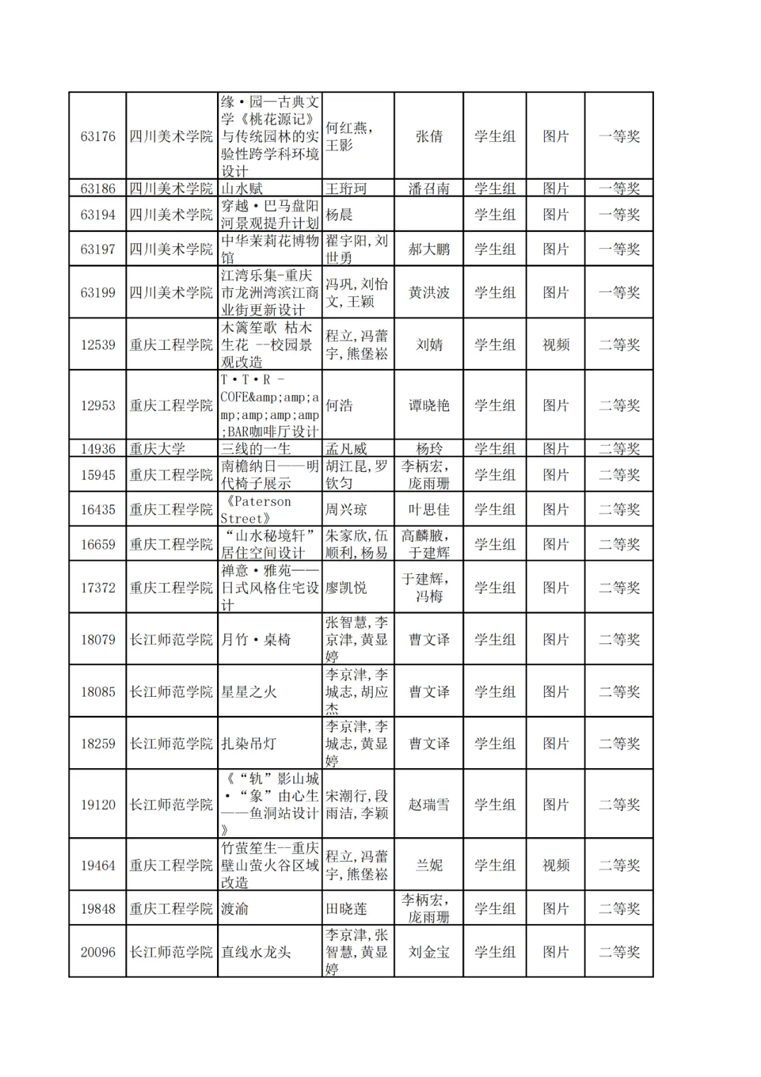 学生组获奖作品表。
