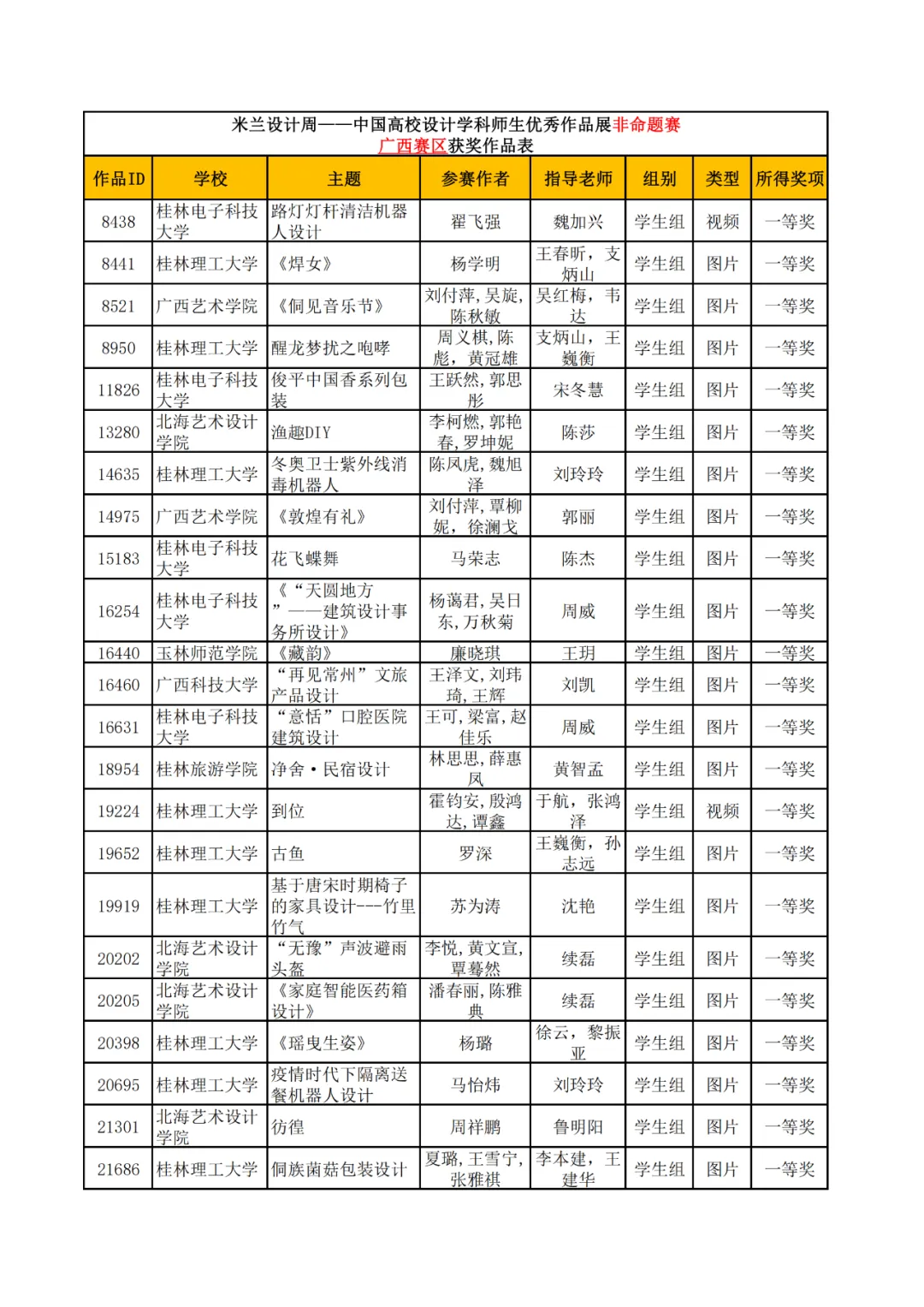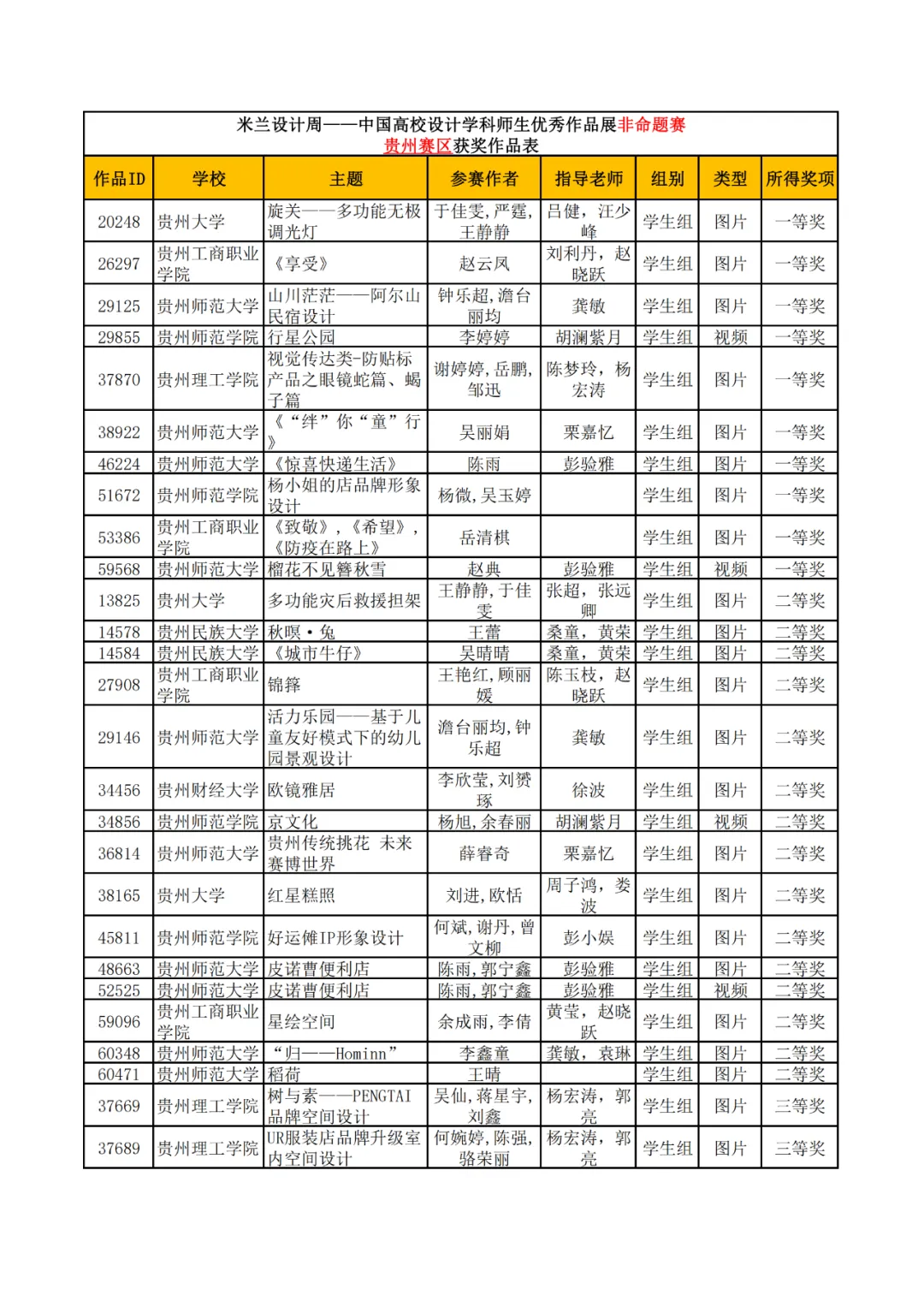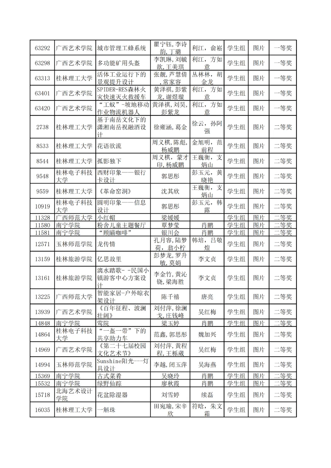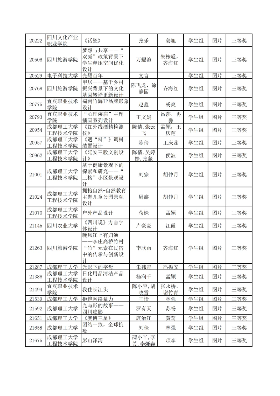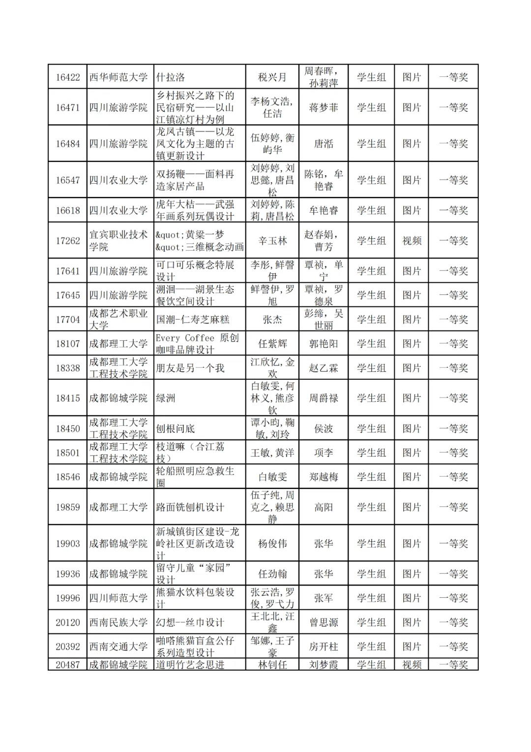 学生组获奖作品表。
