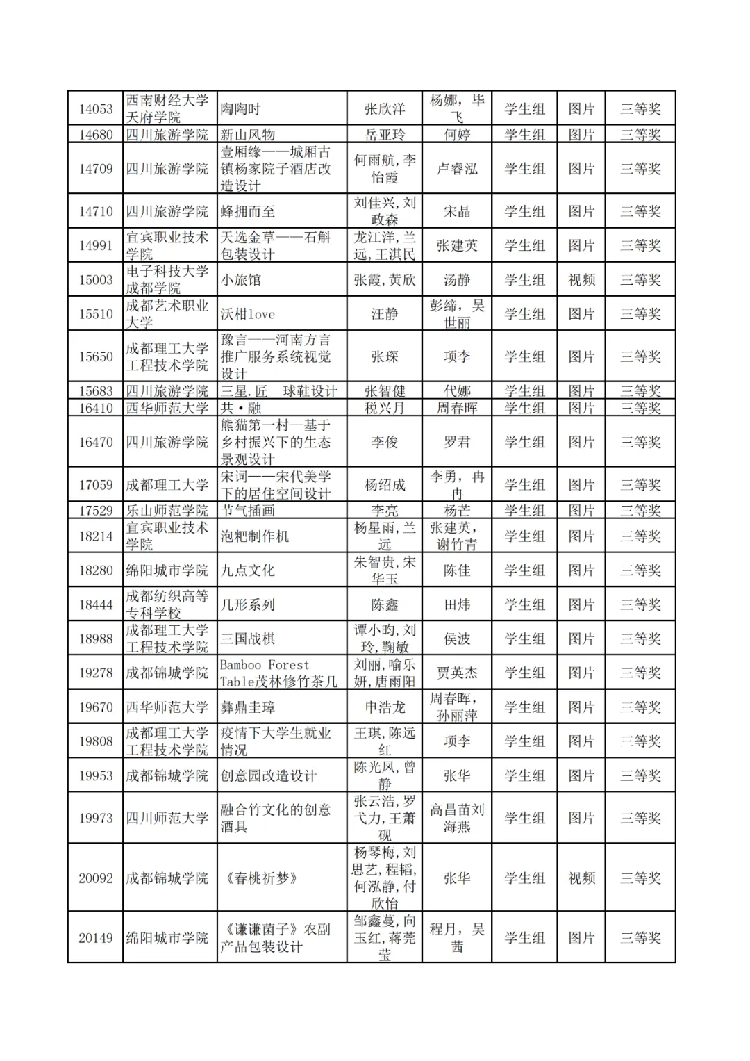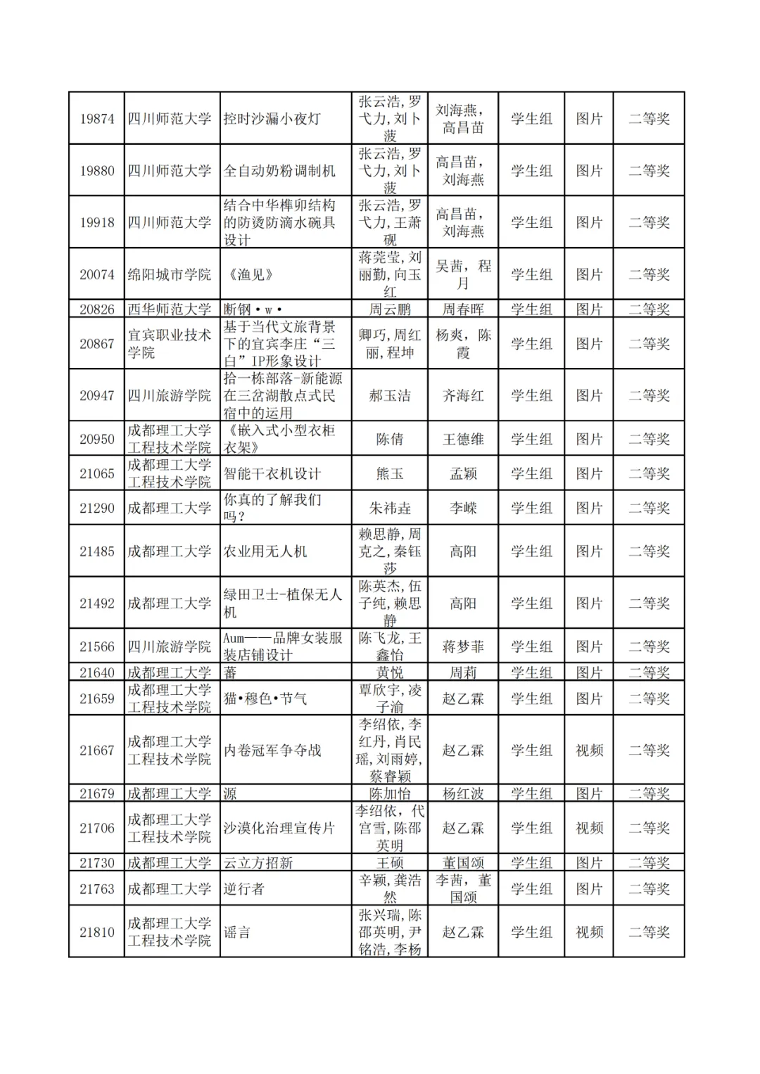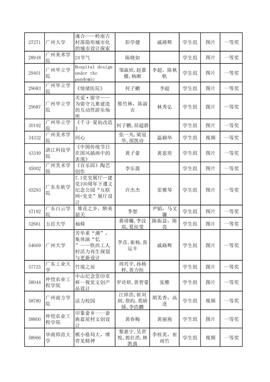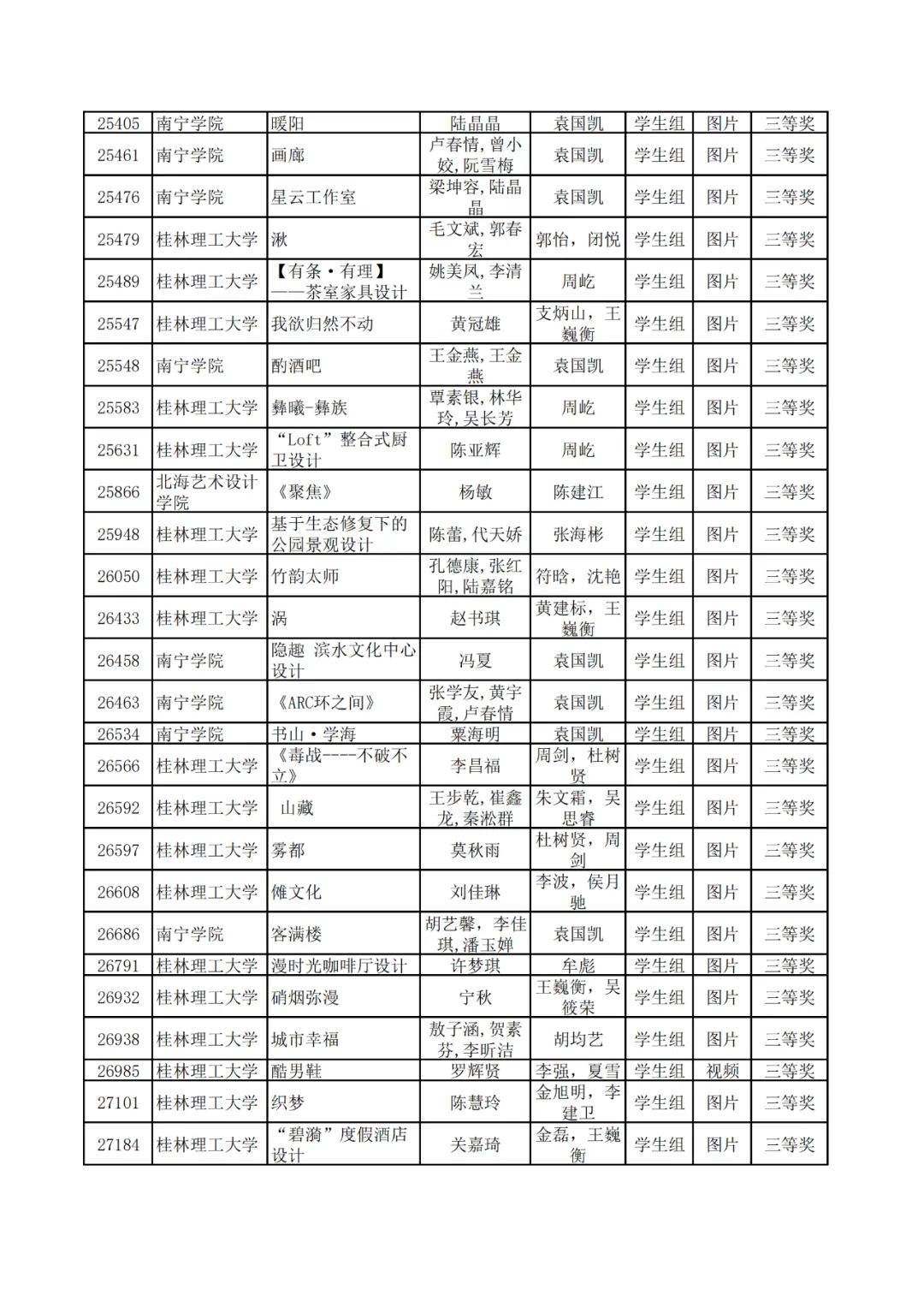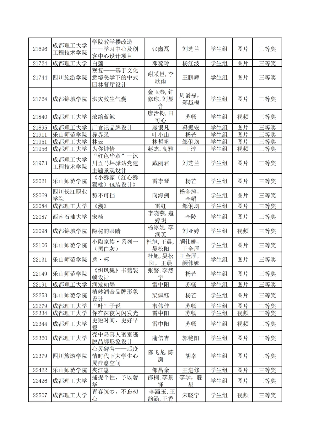 学生组获奖作品表。