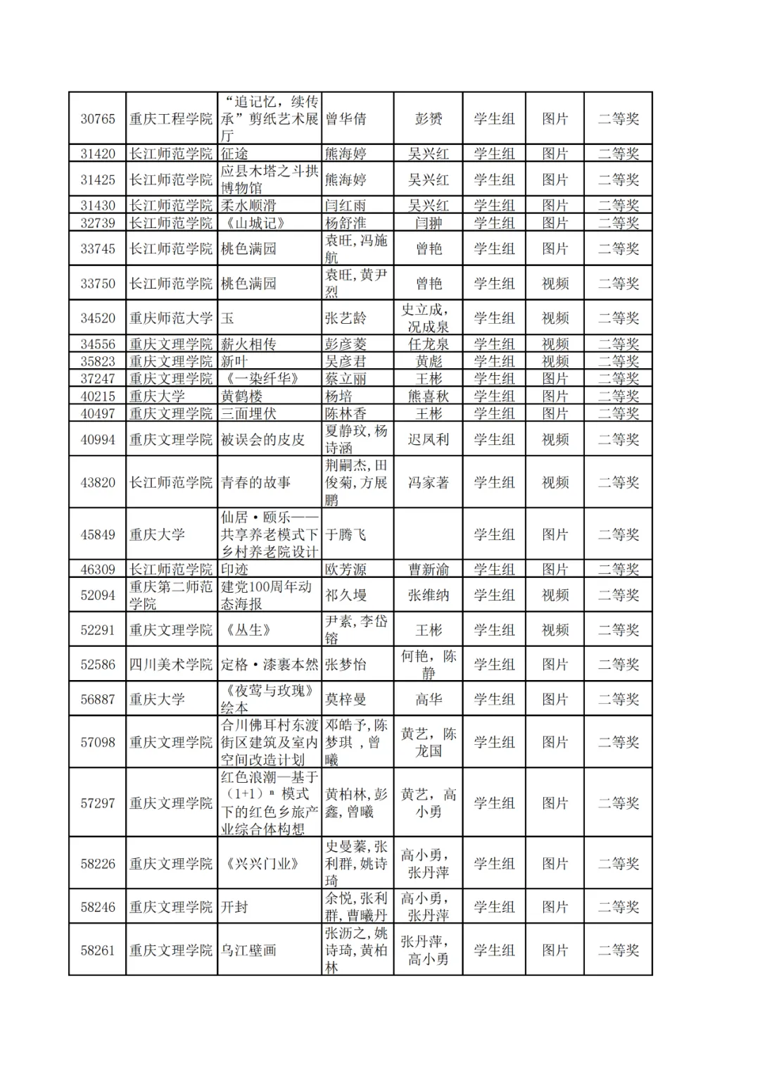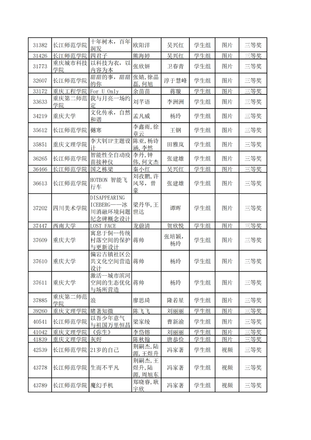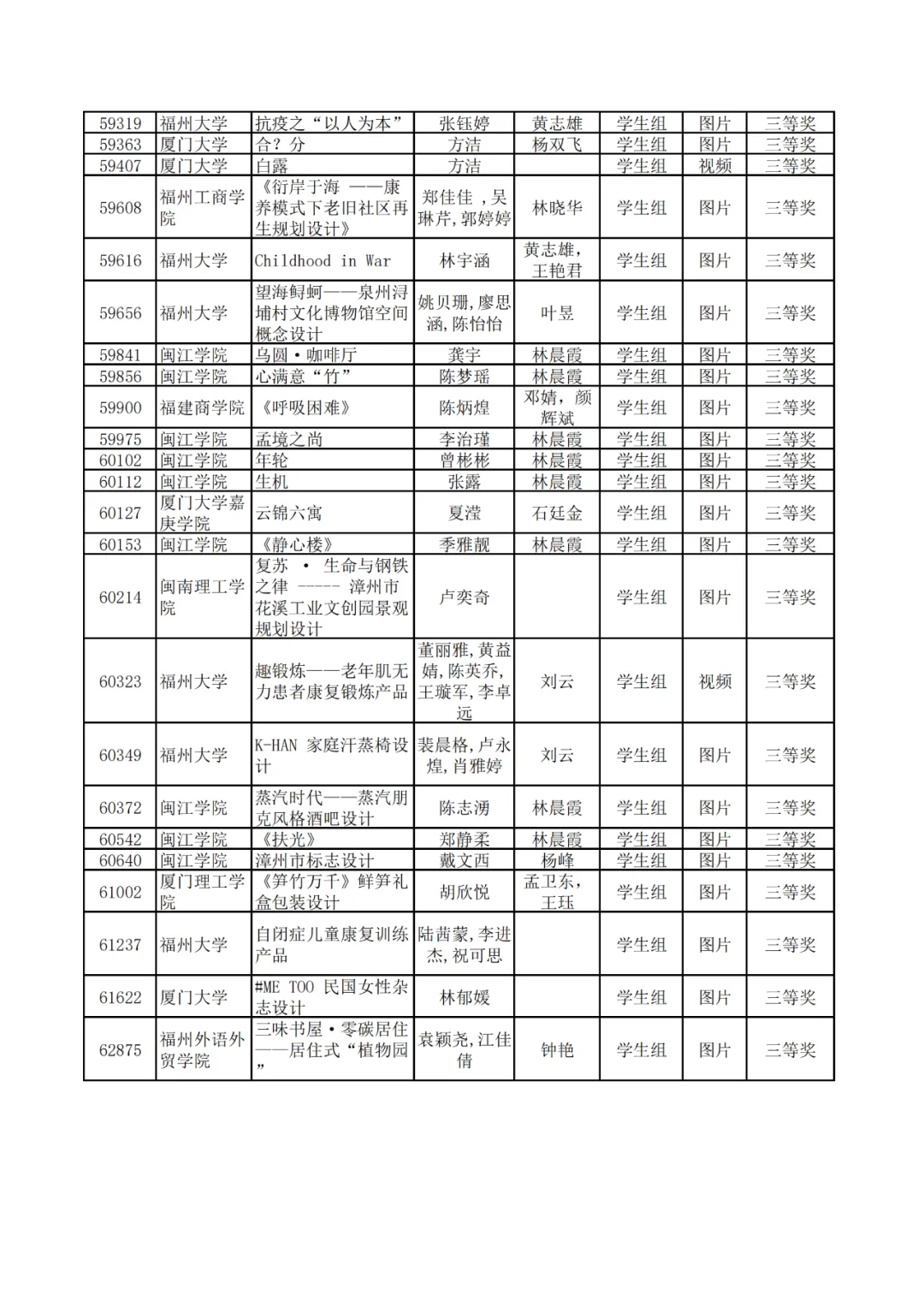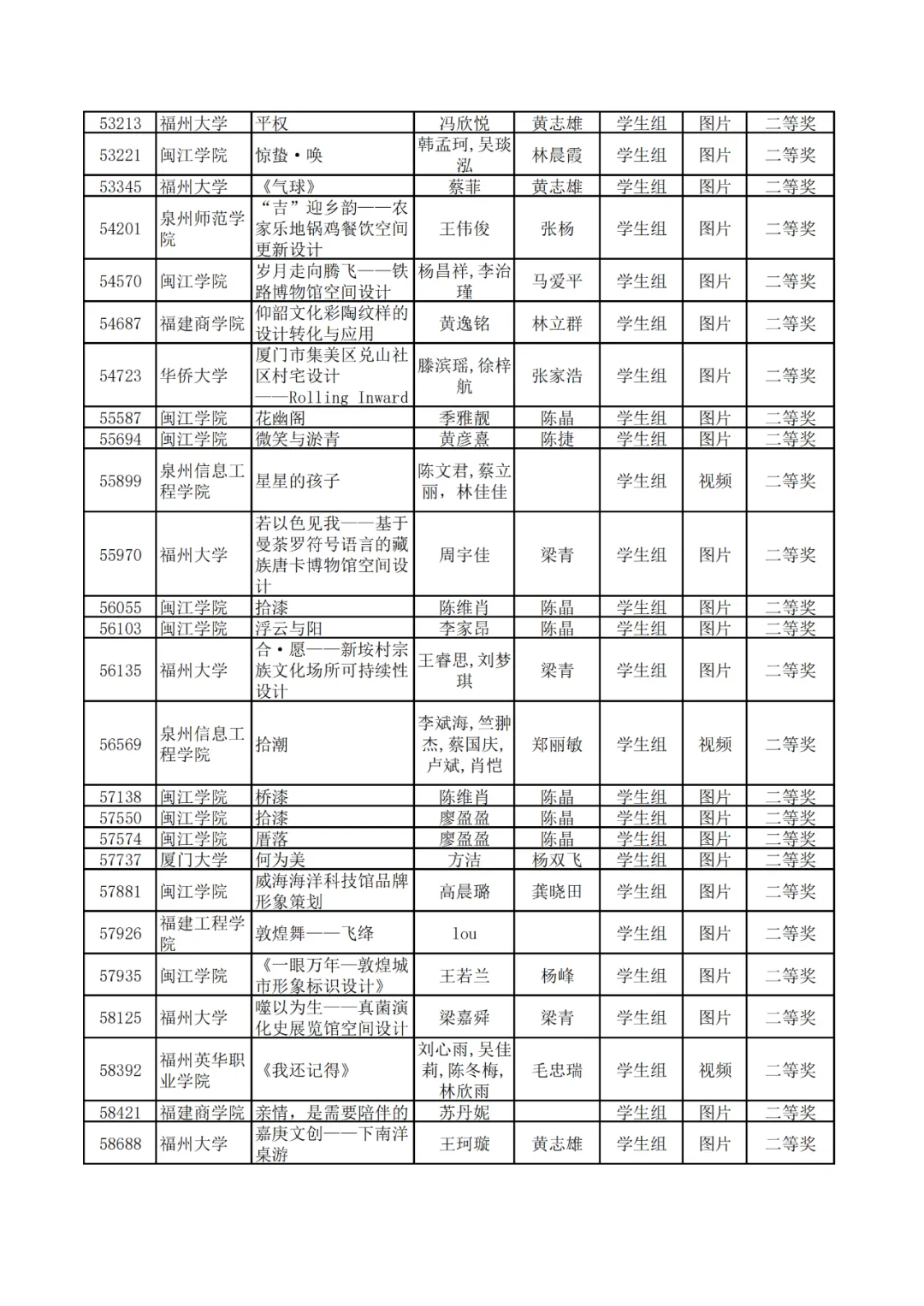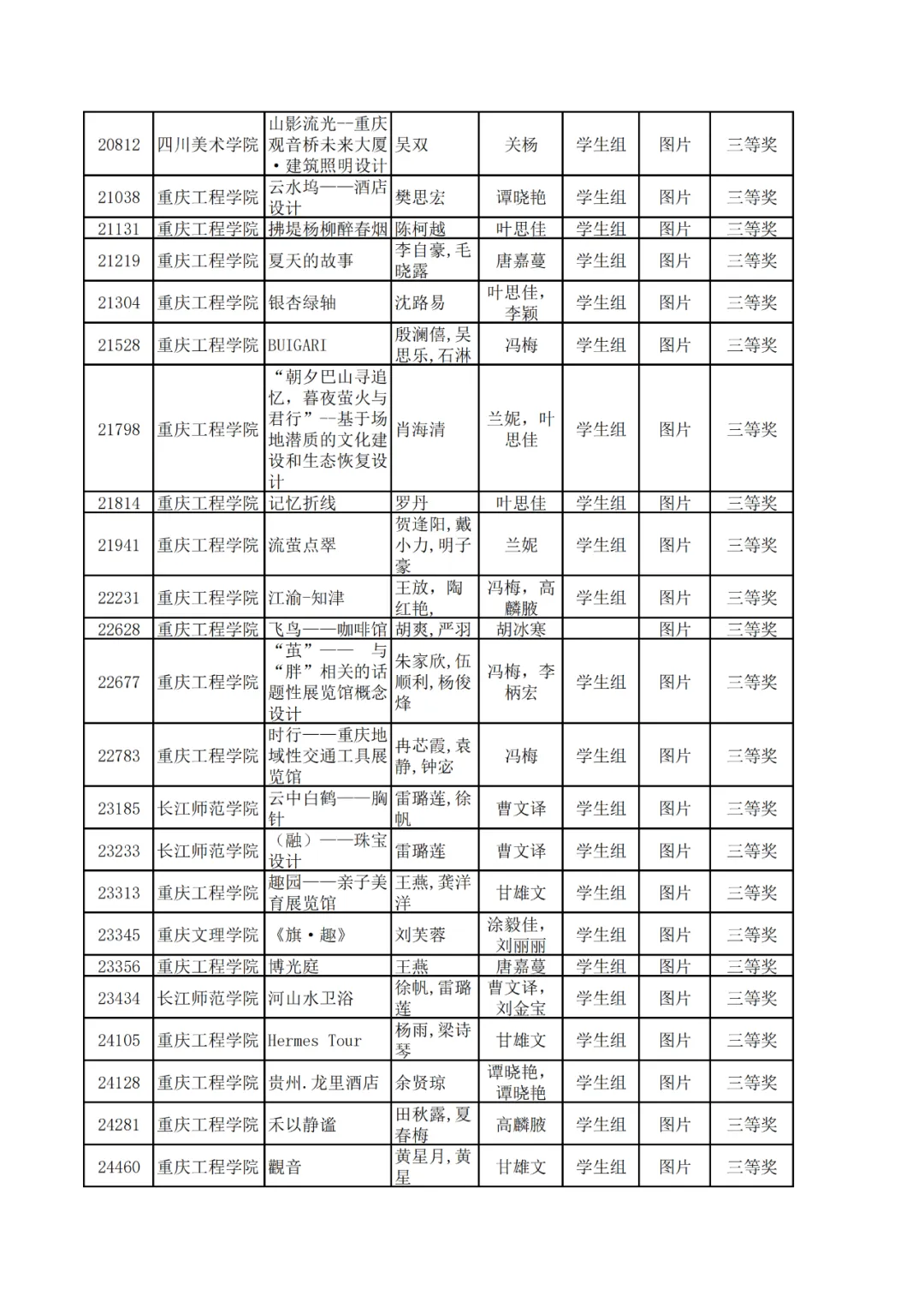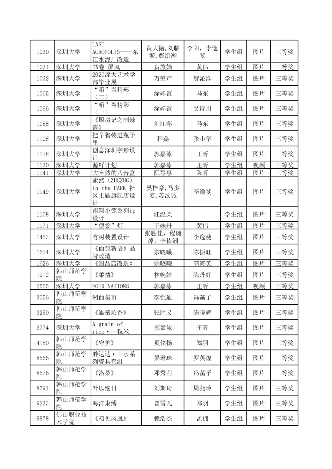 学生组获奖作品表。