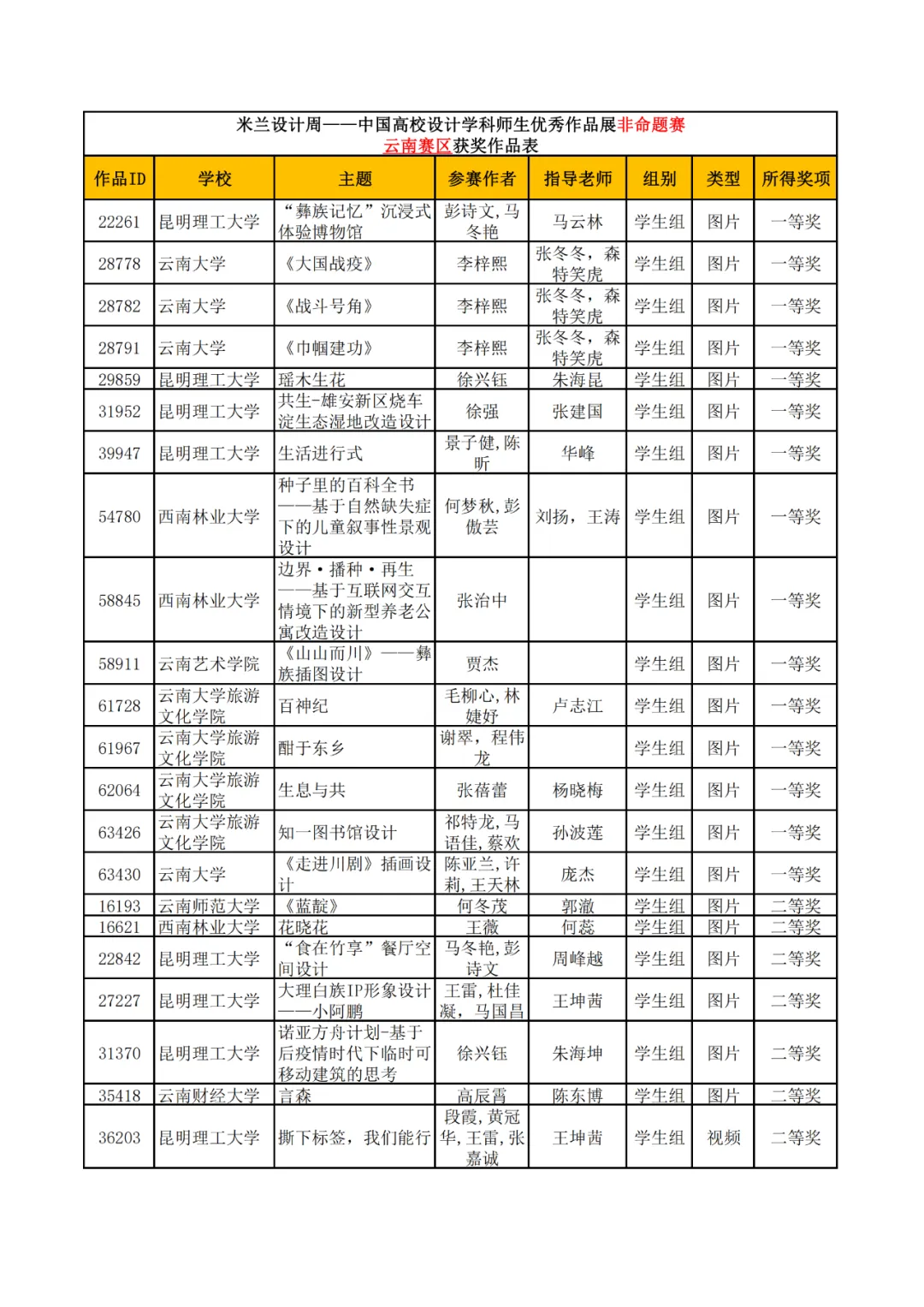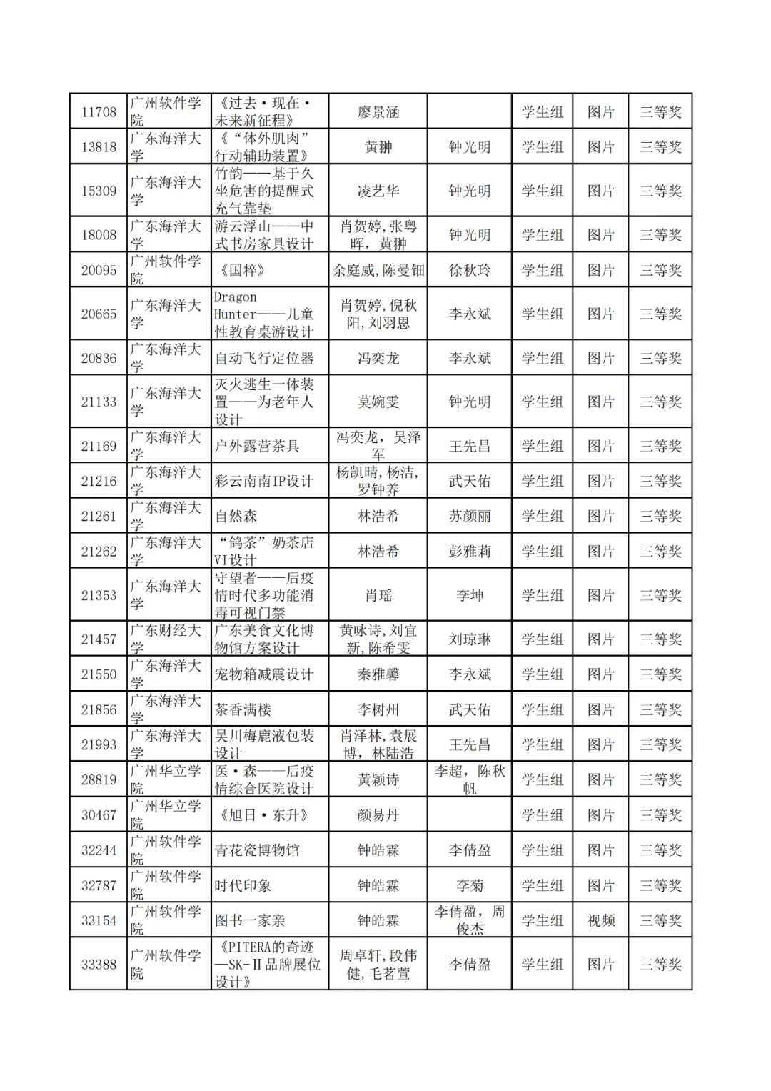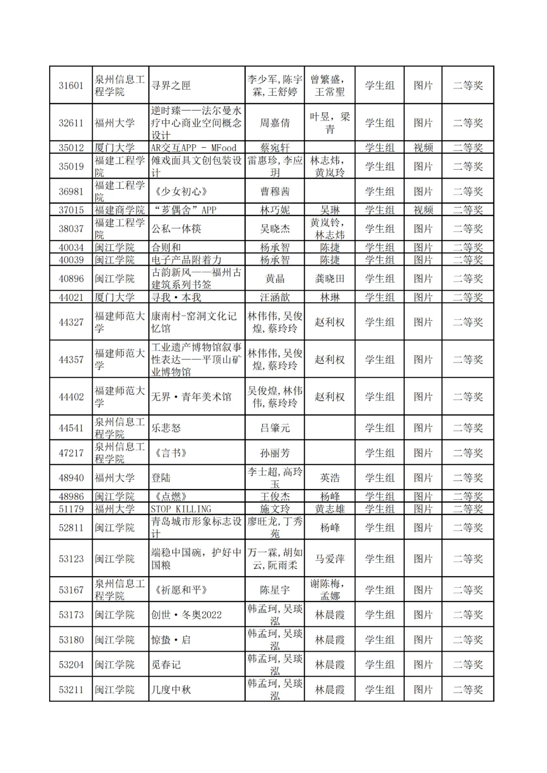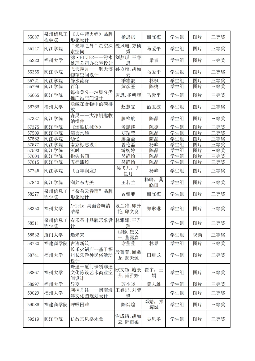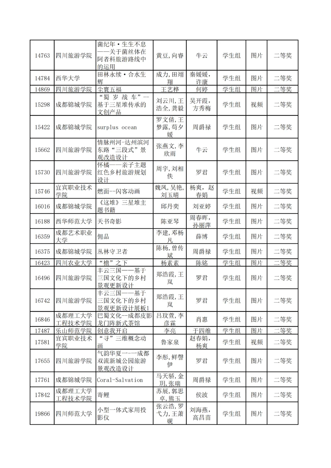 学生组获奖作品表。