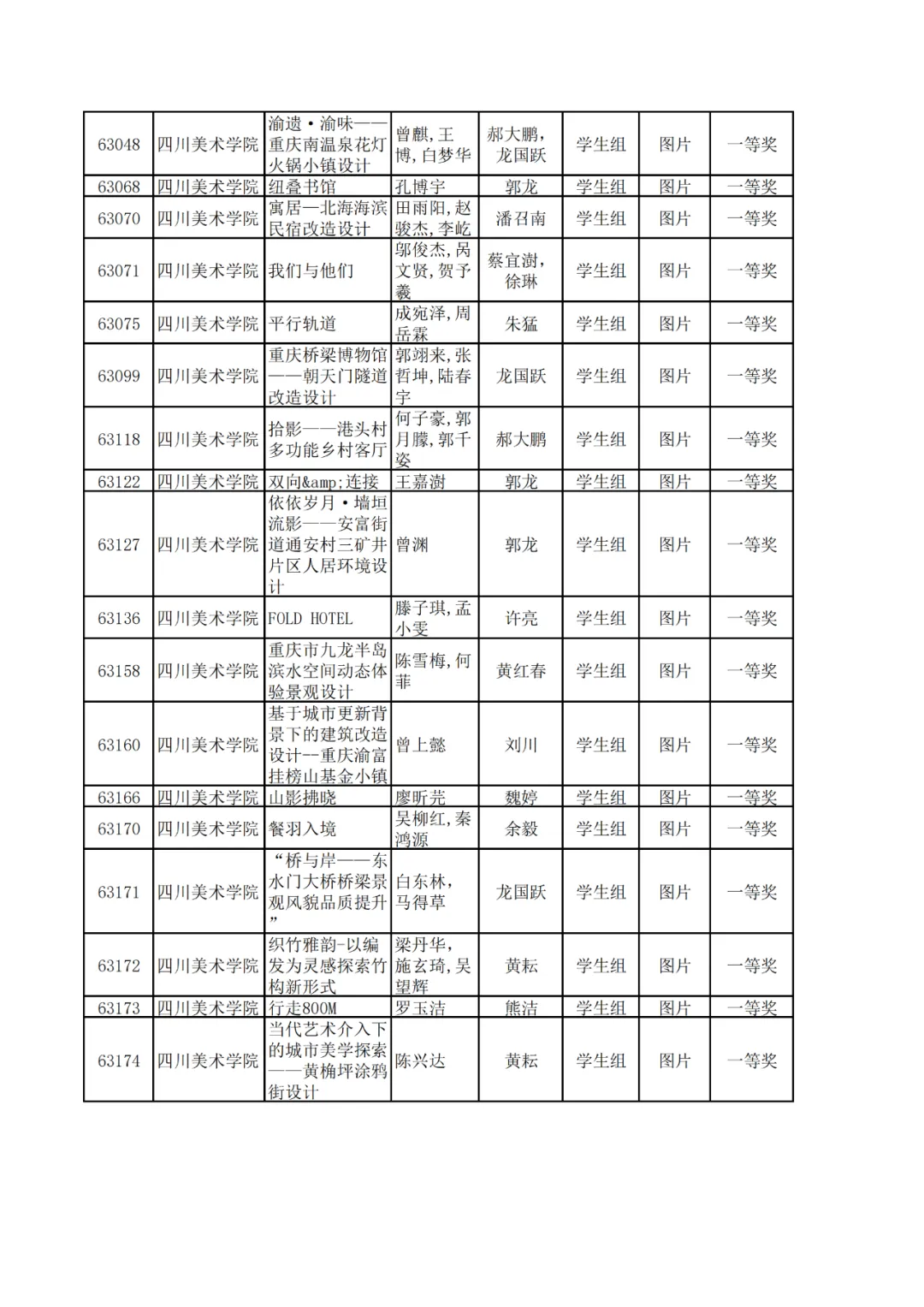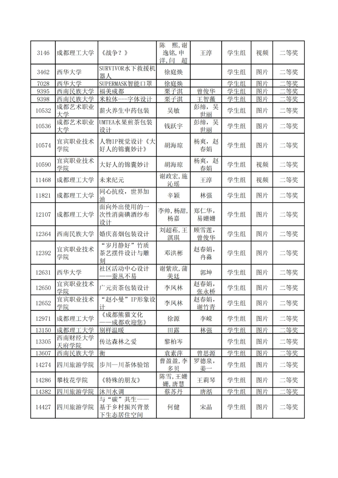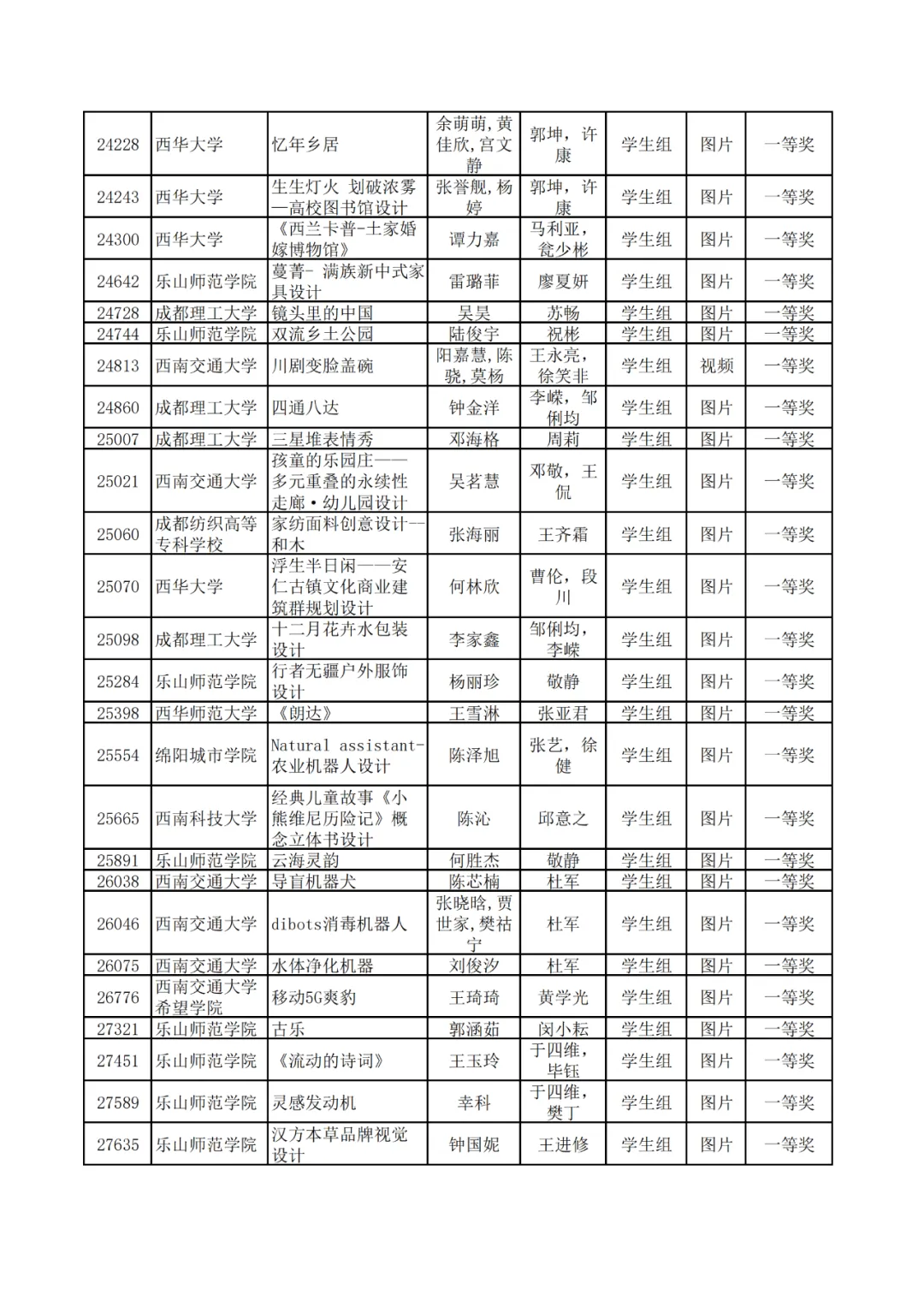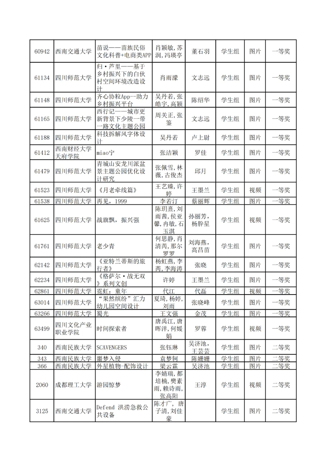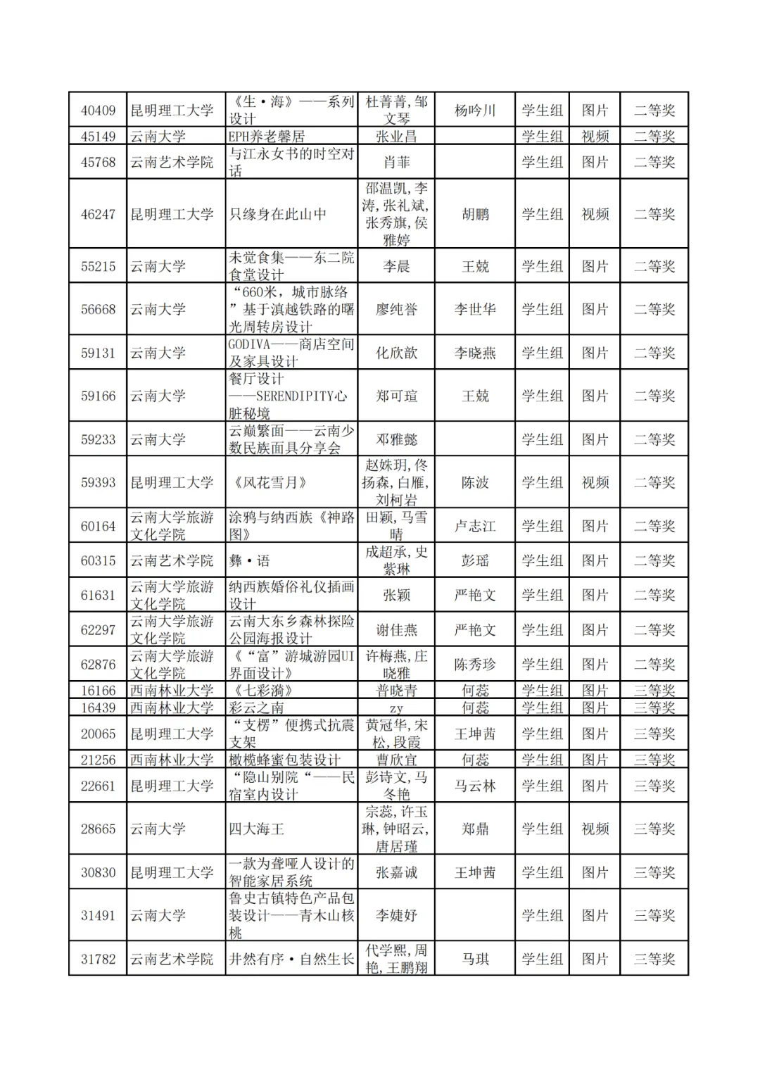 学生组获奖作品表。