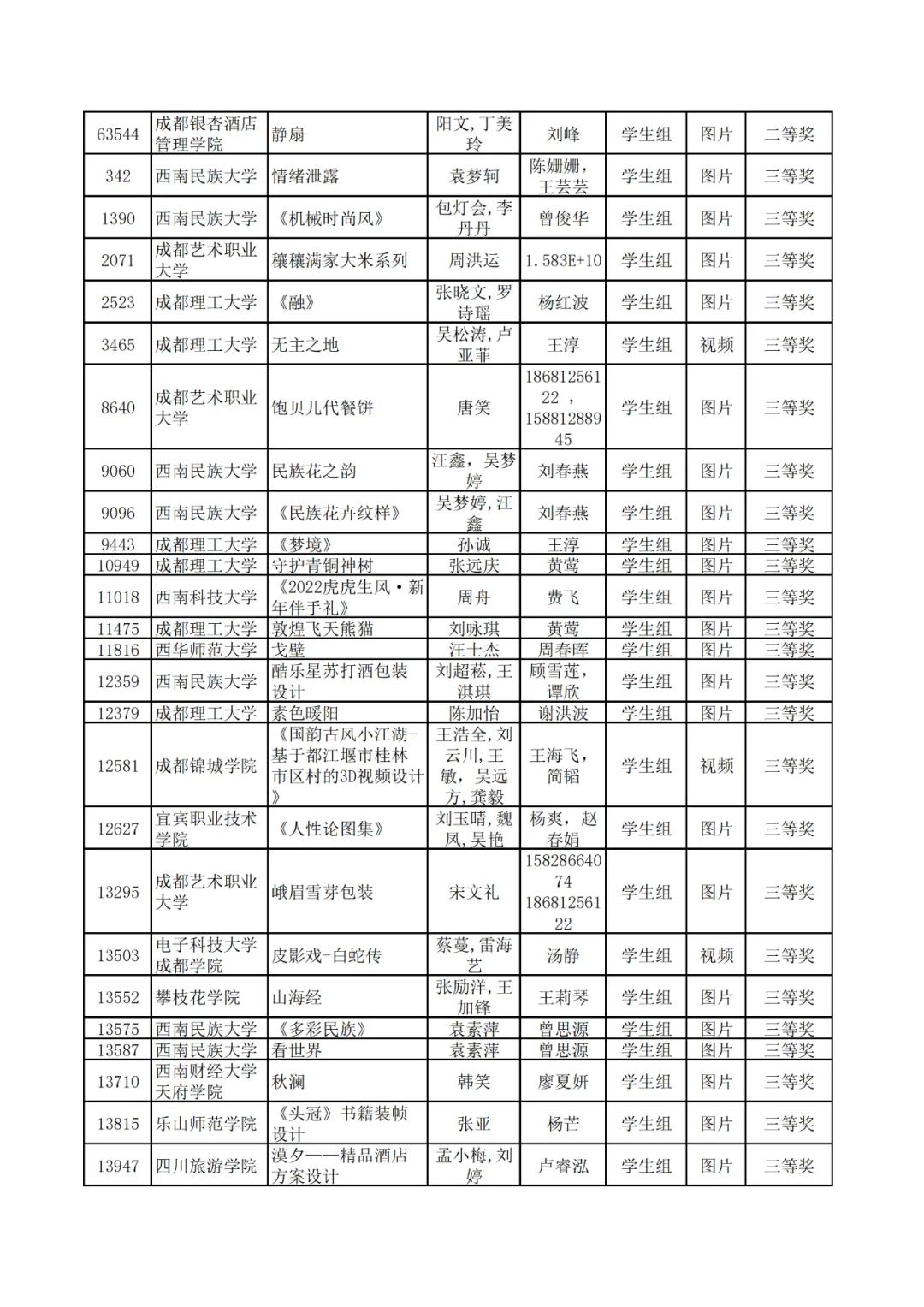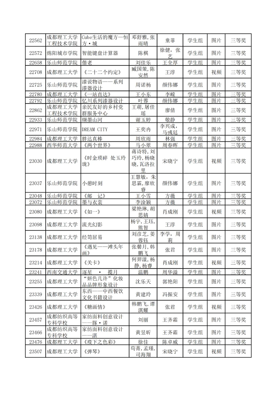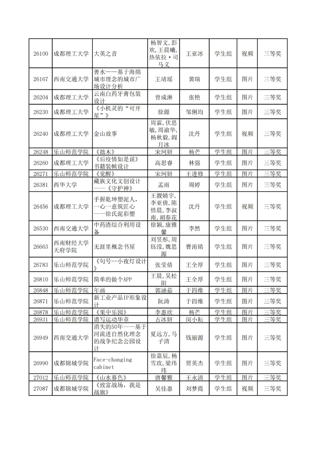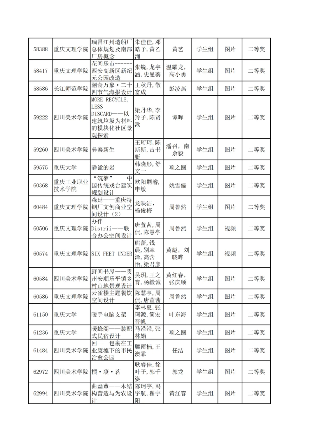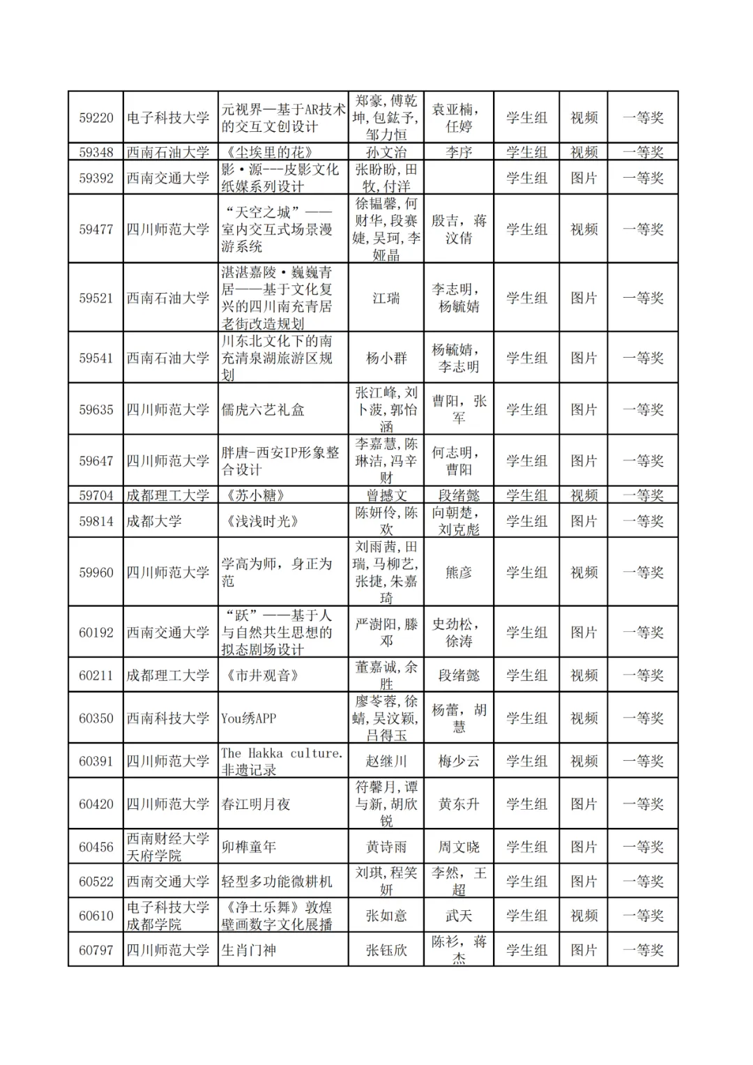 学生组获奖作品表。