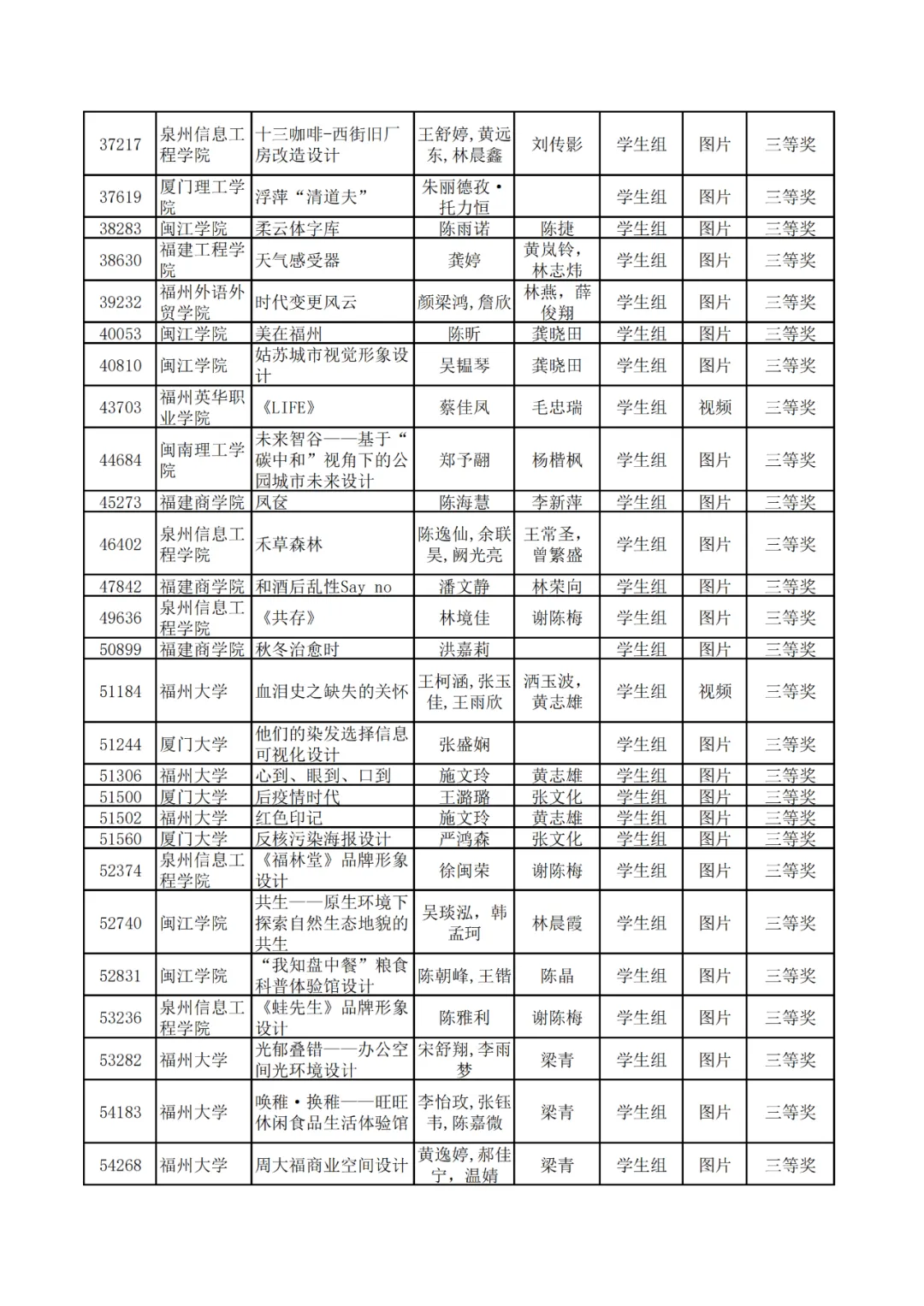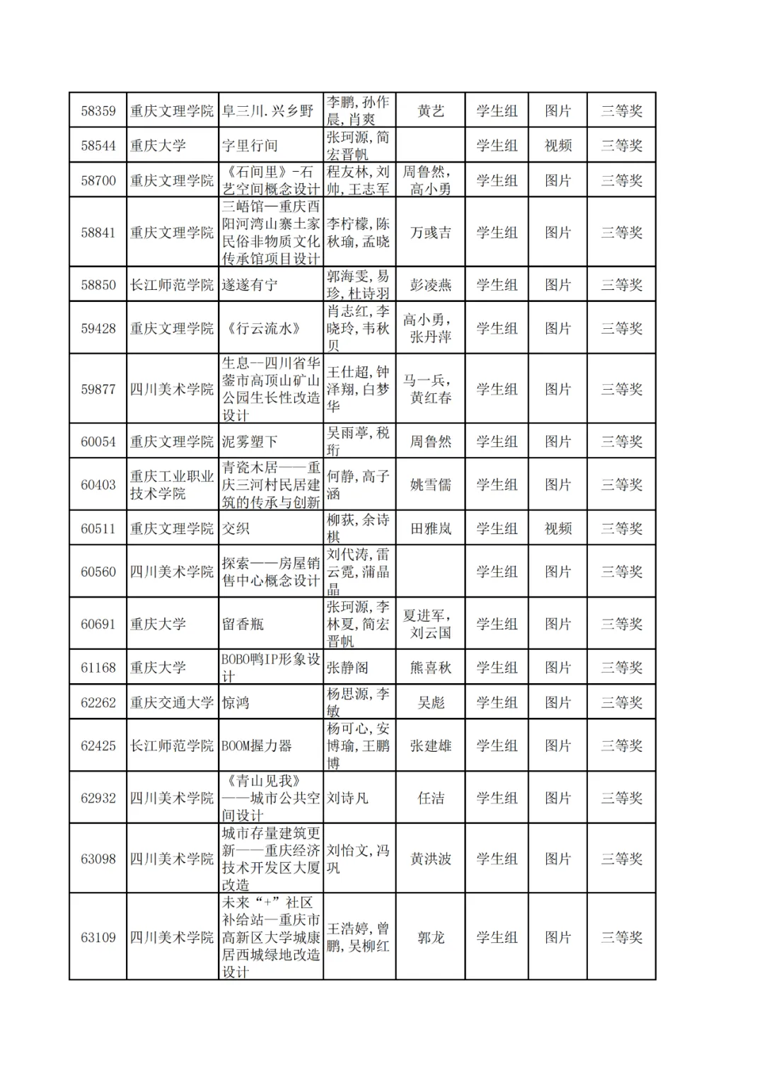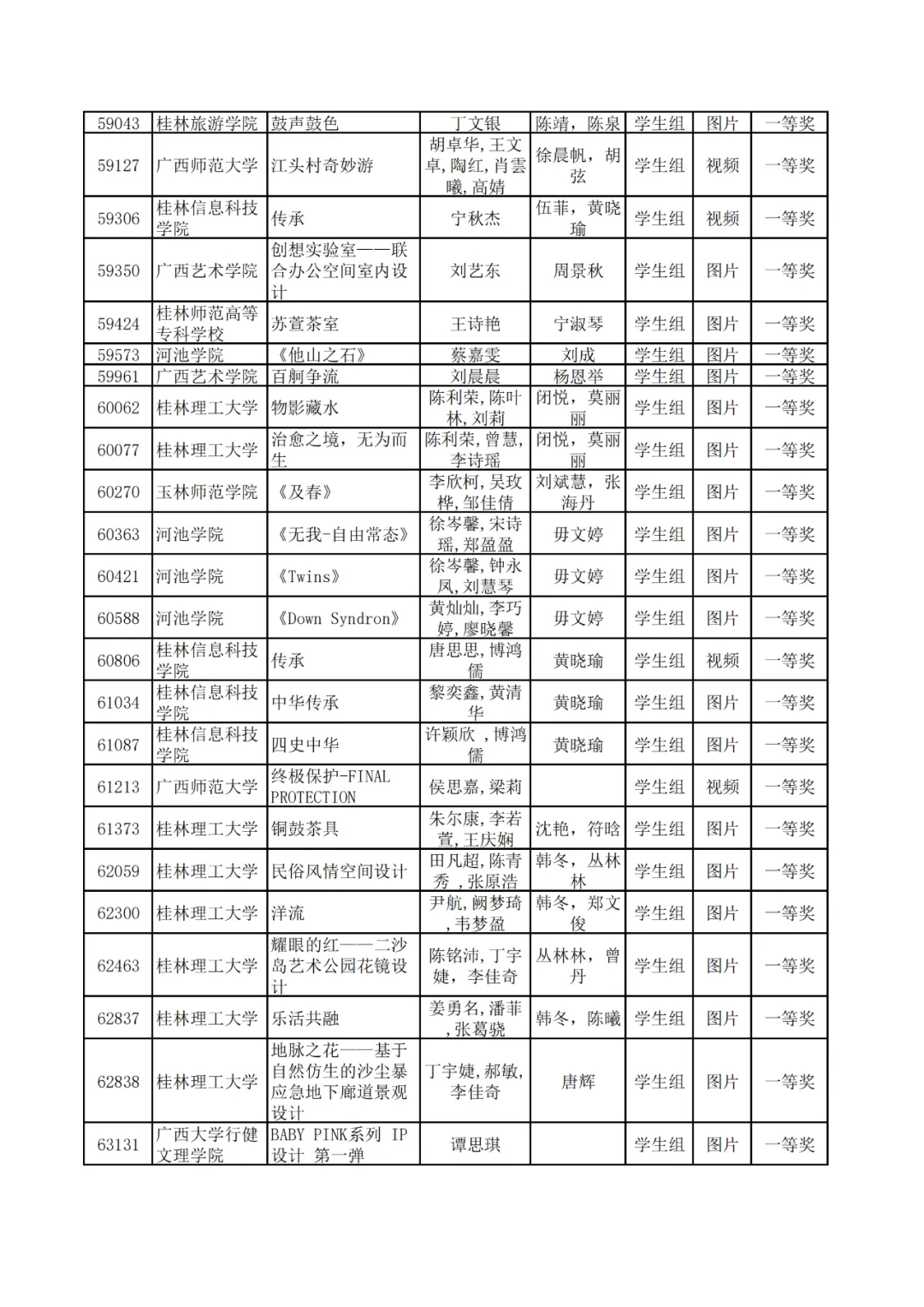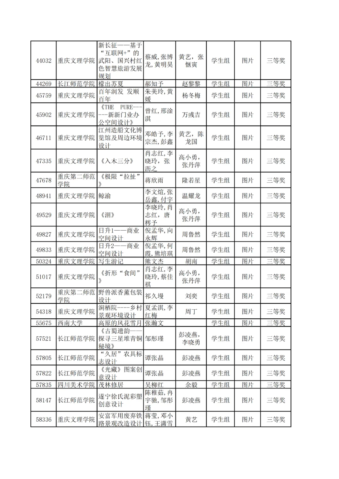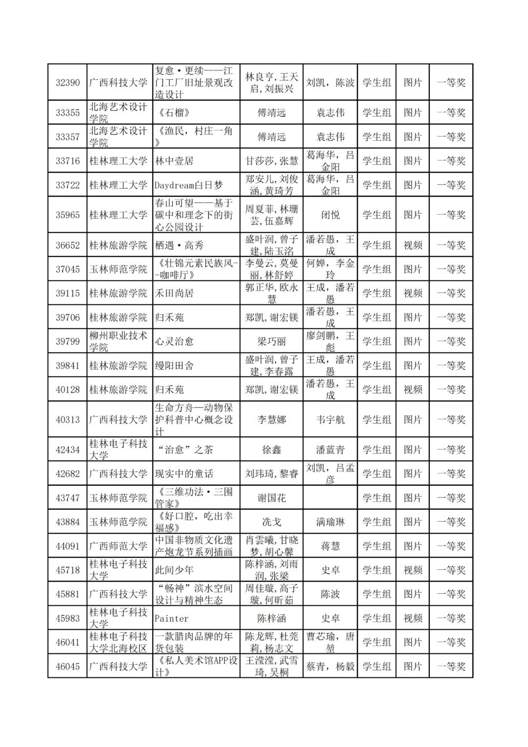 学生组获奖作品表。