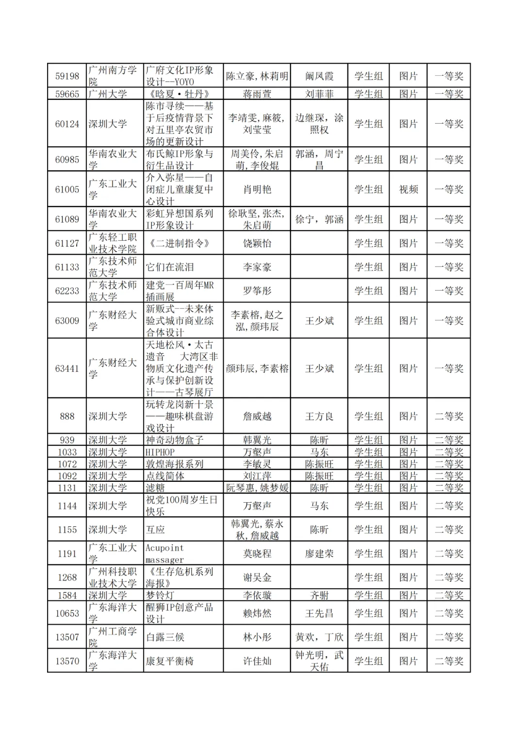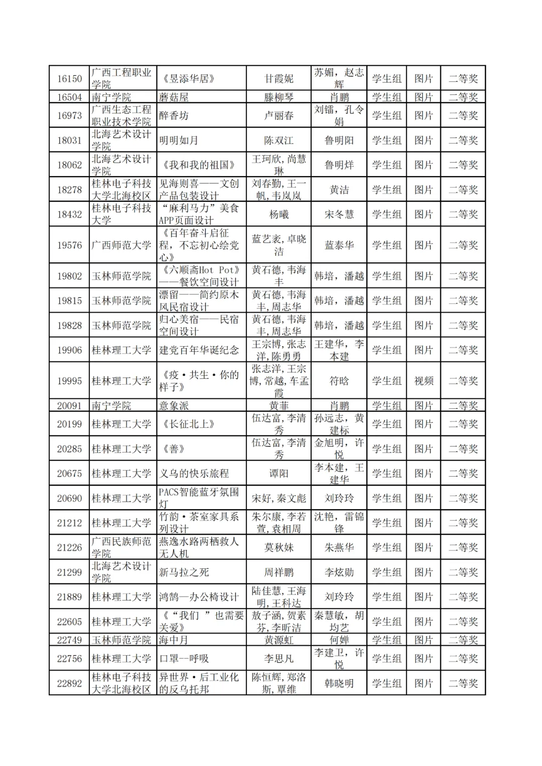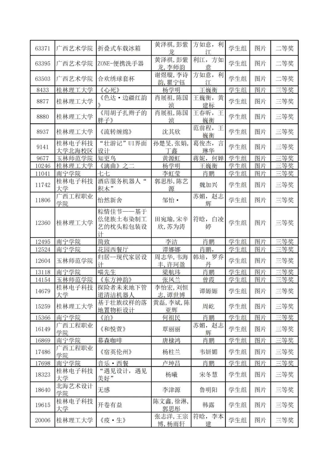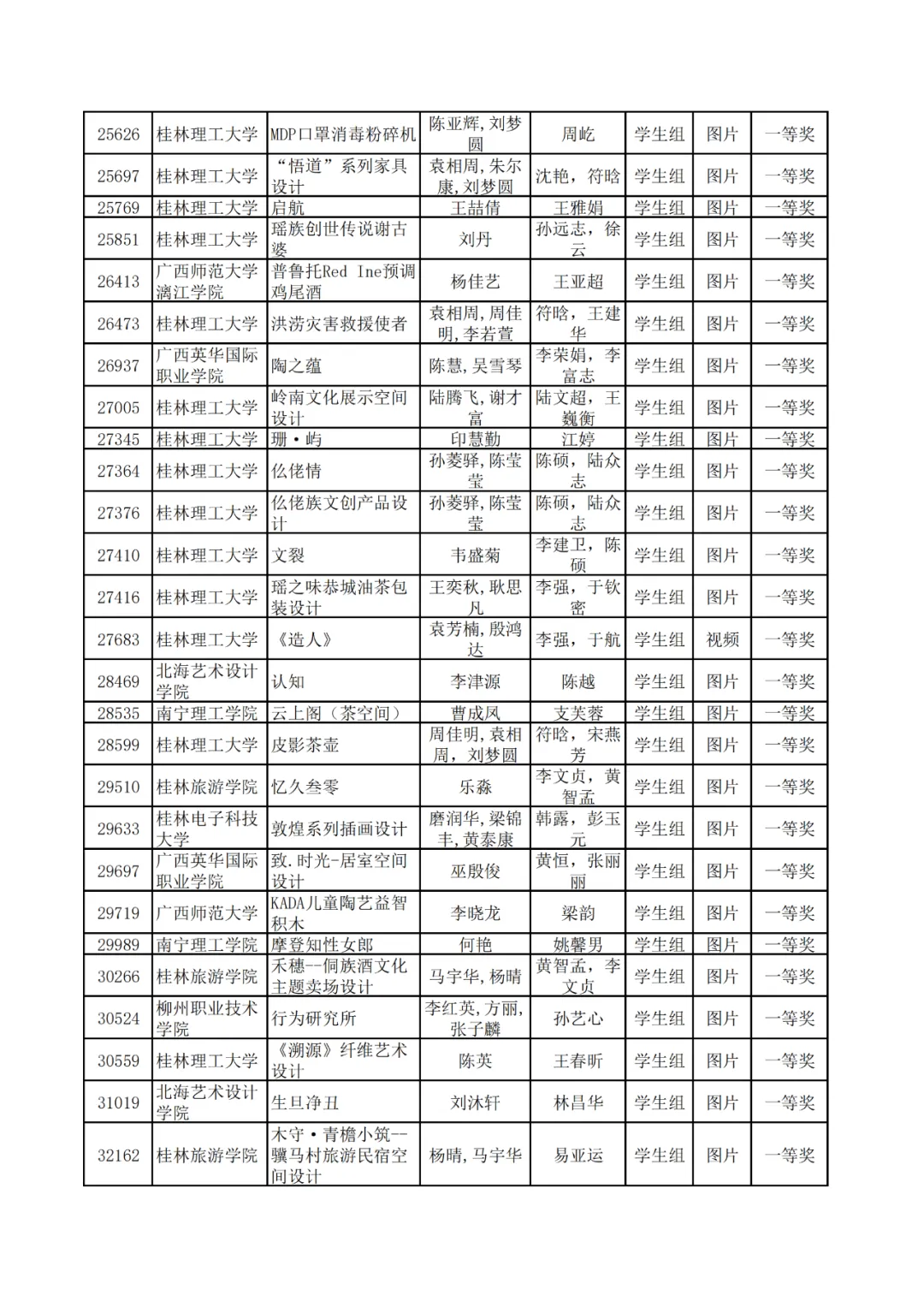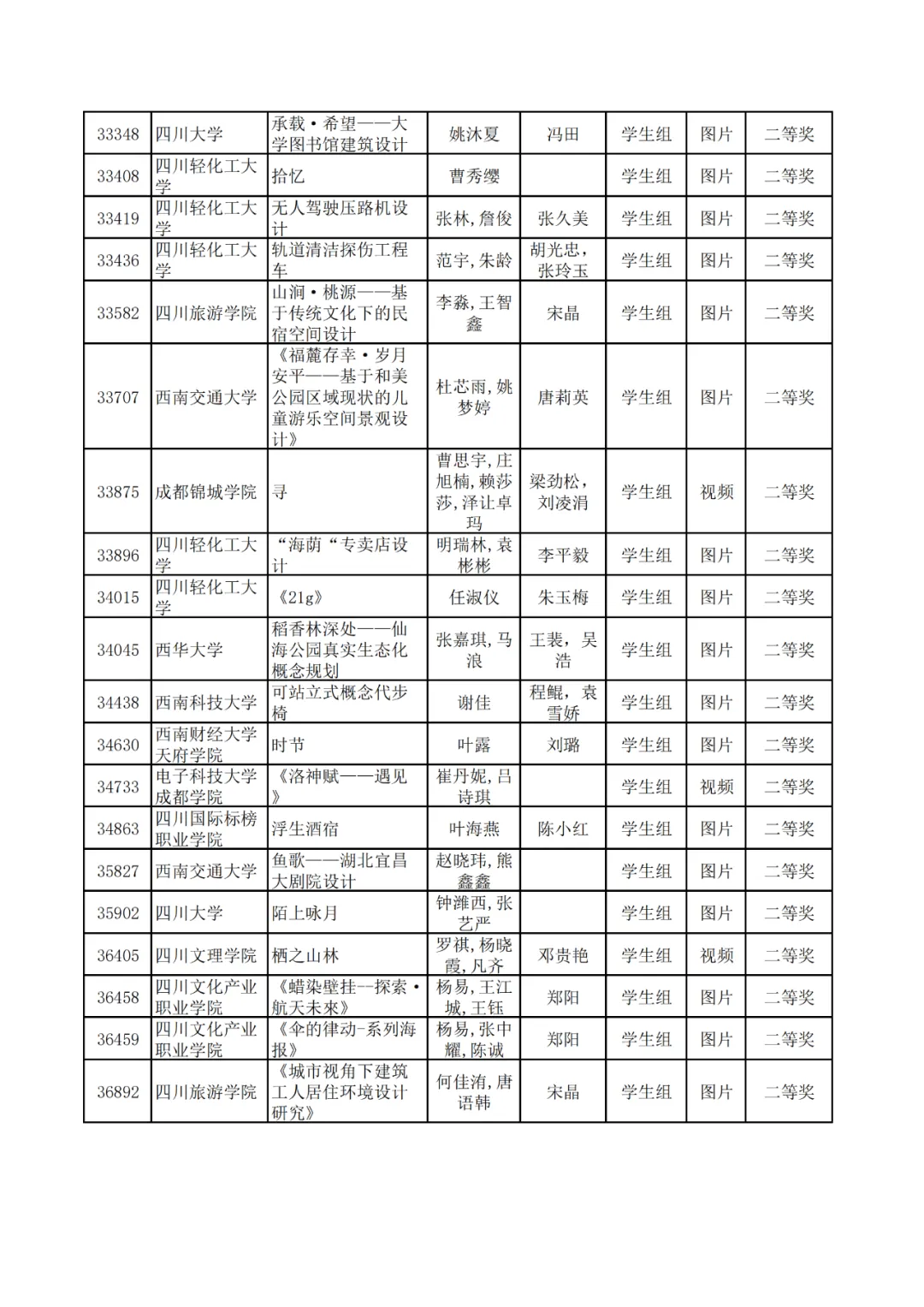 学生组获奖作品表。