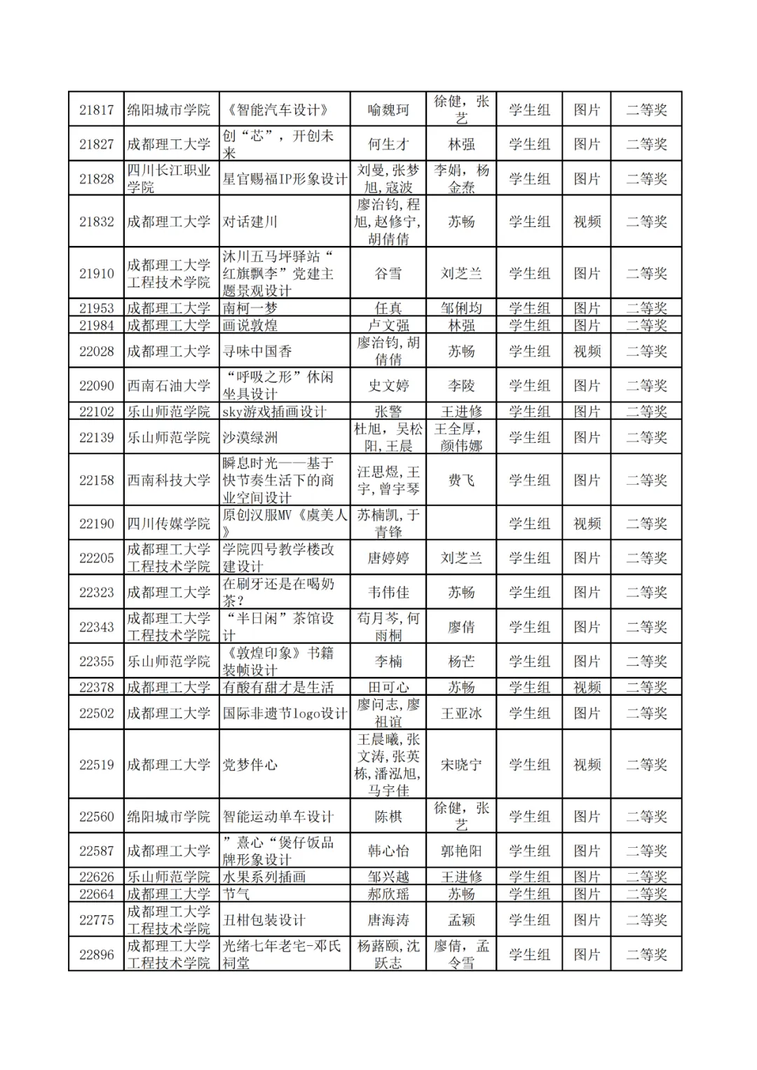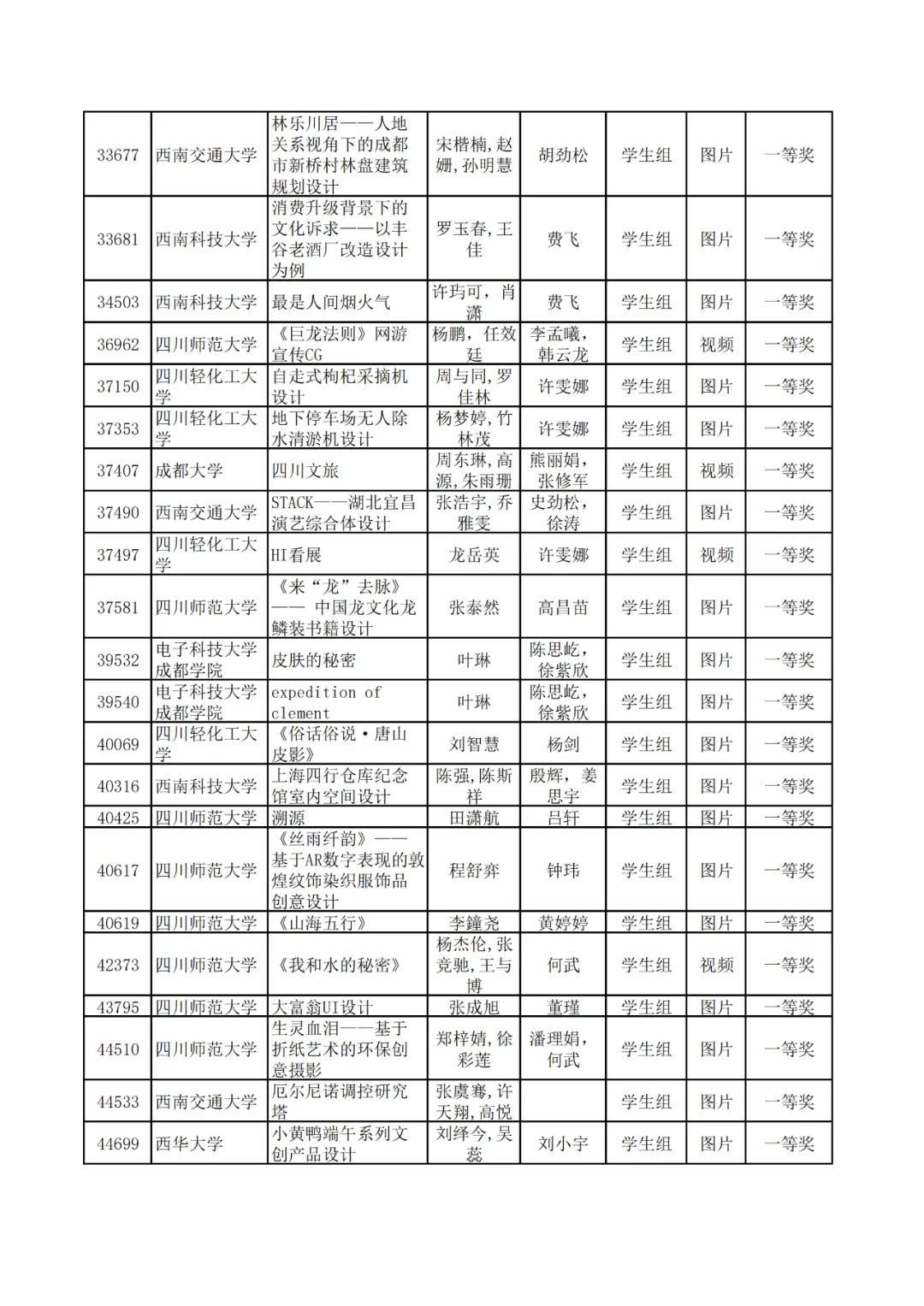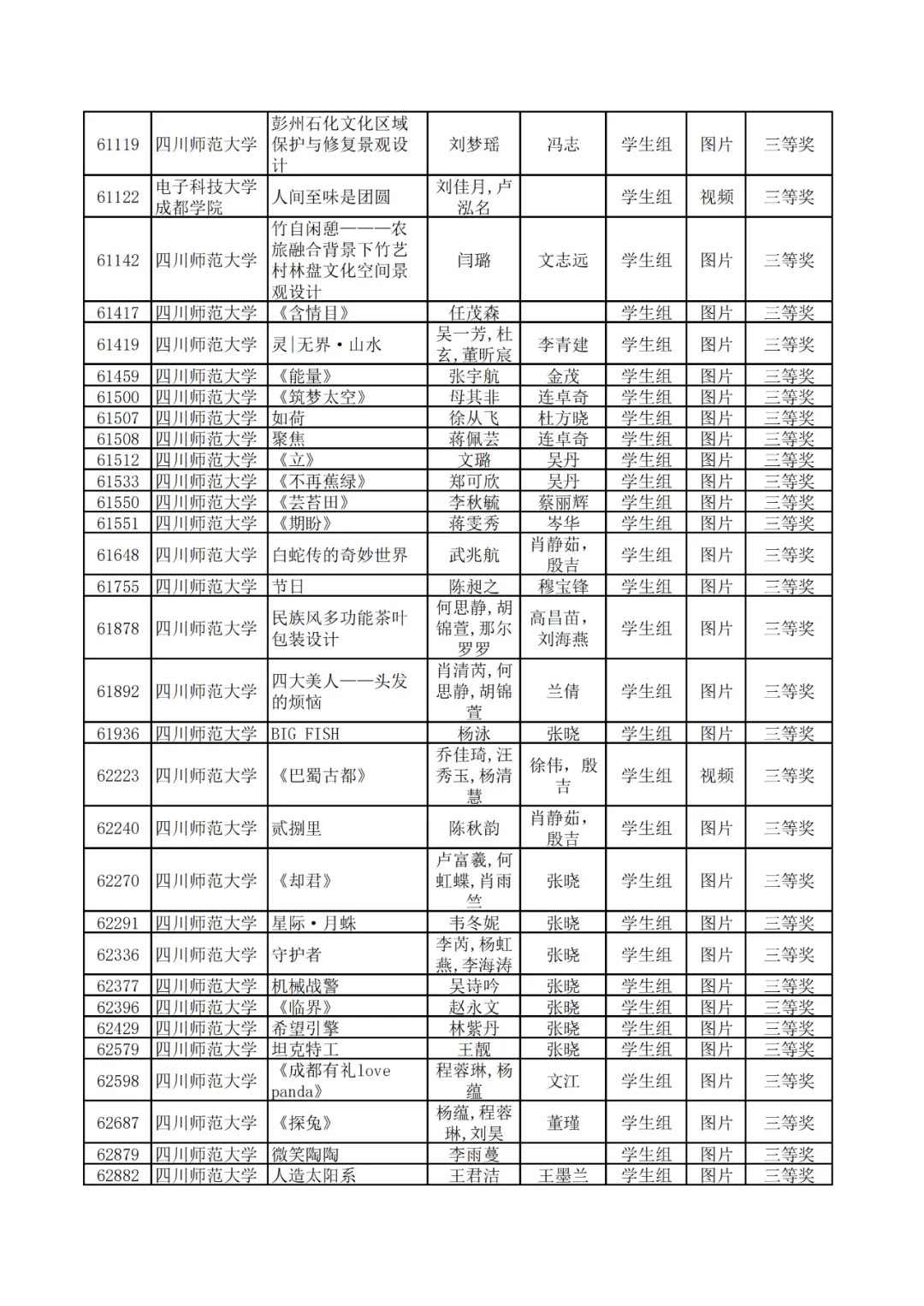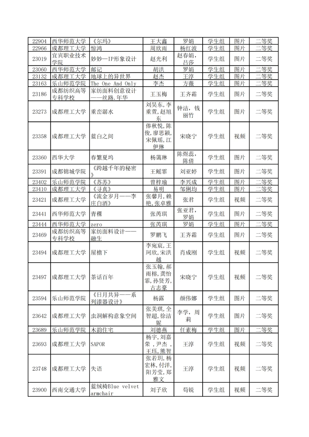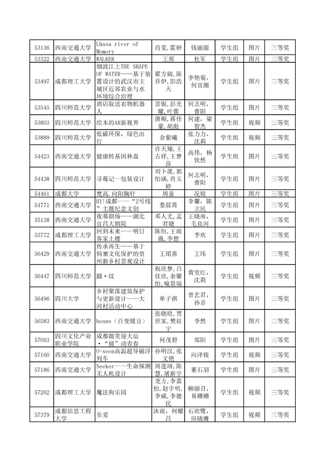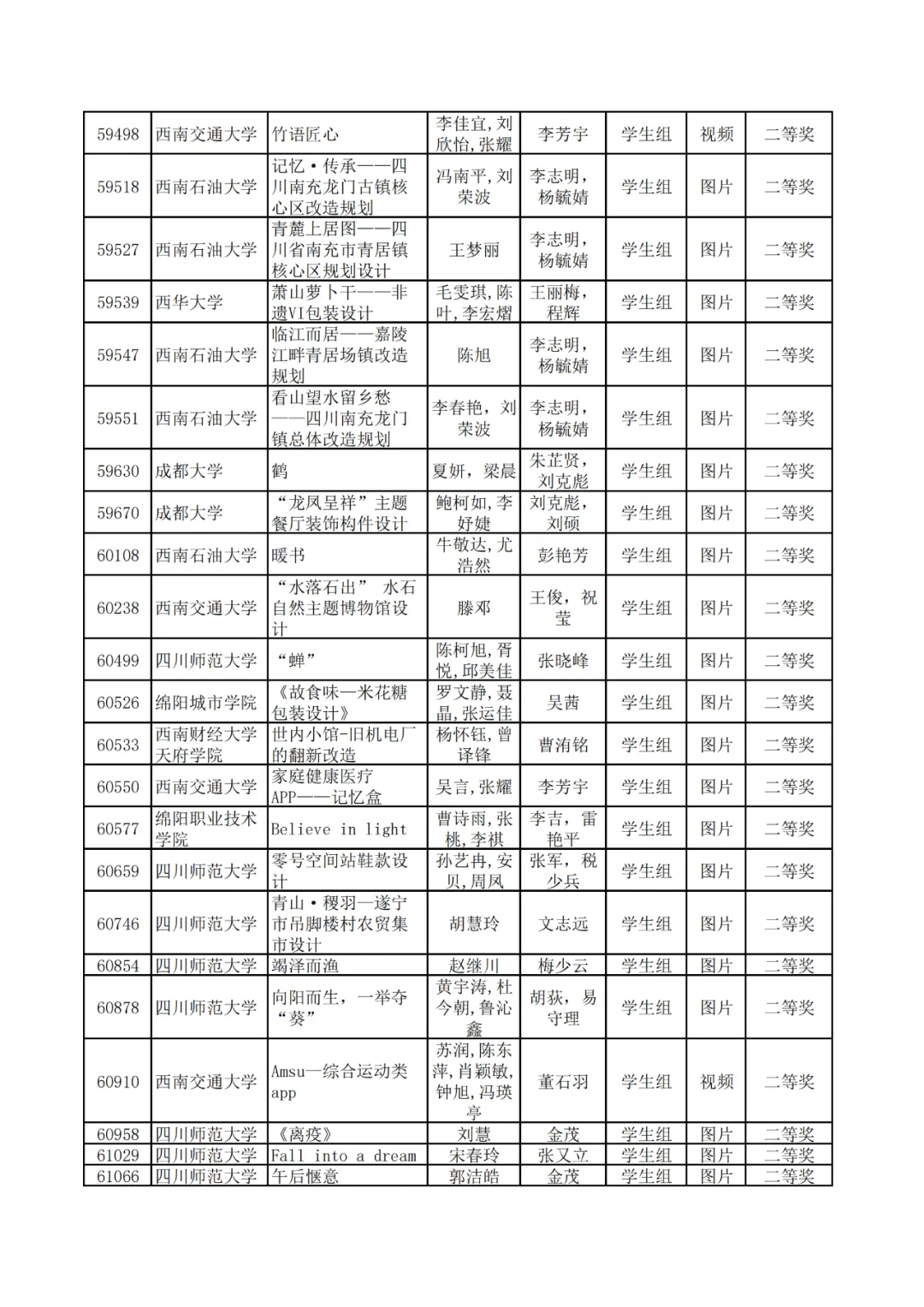 学生组获奖作品表。