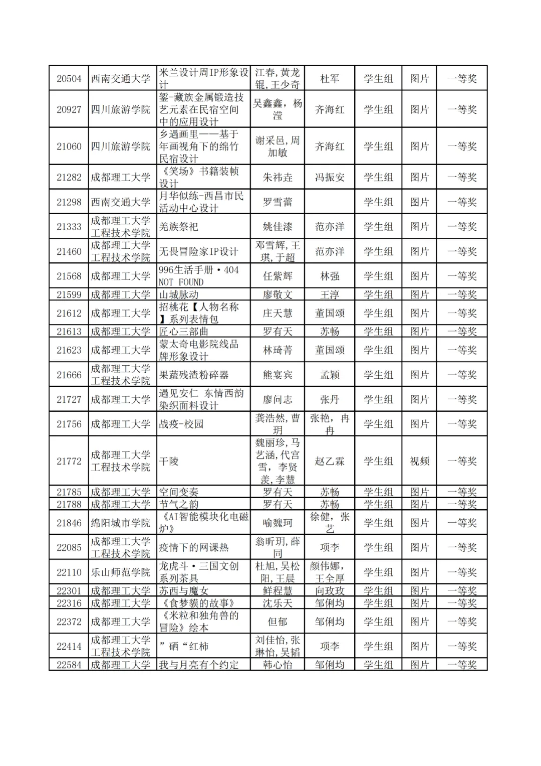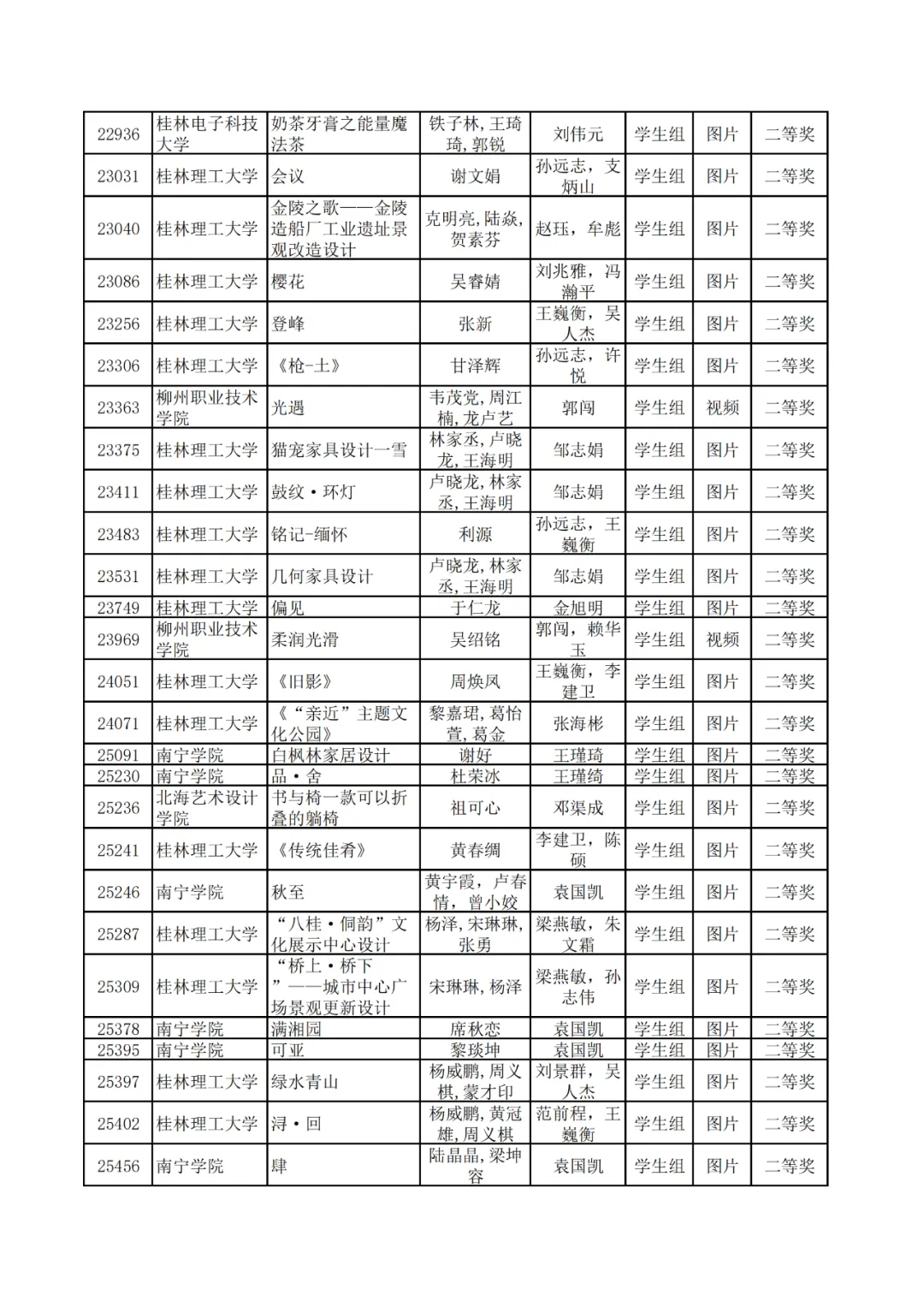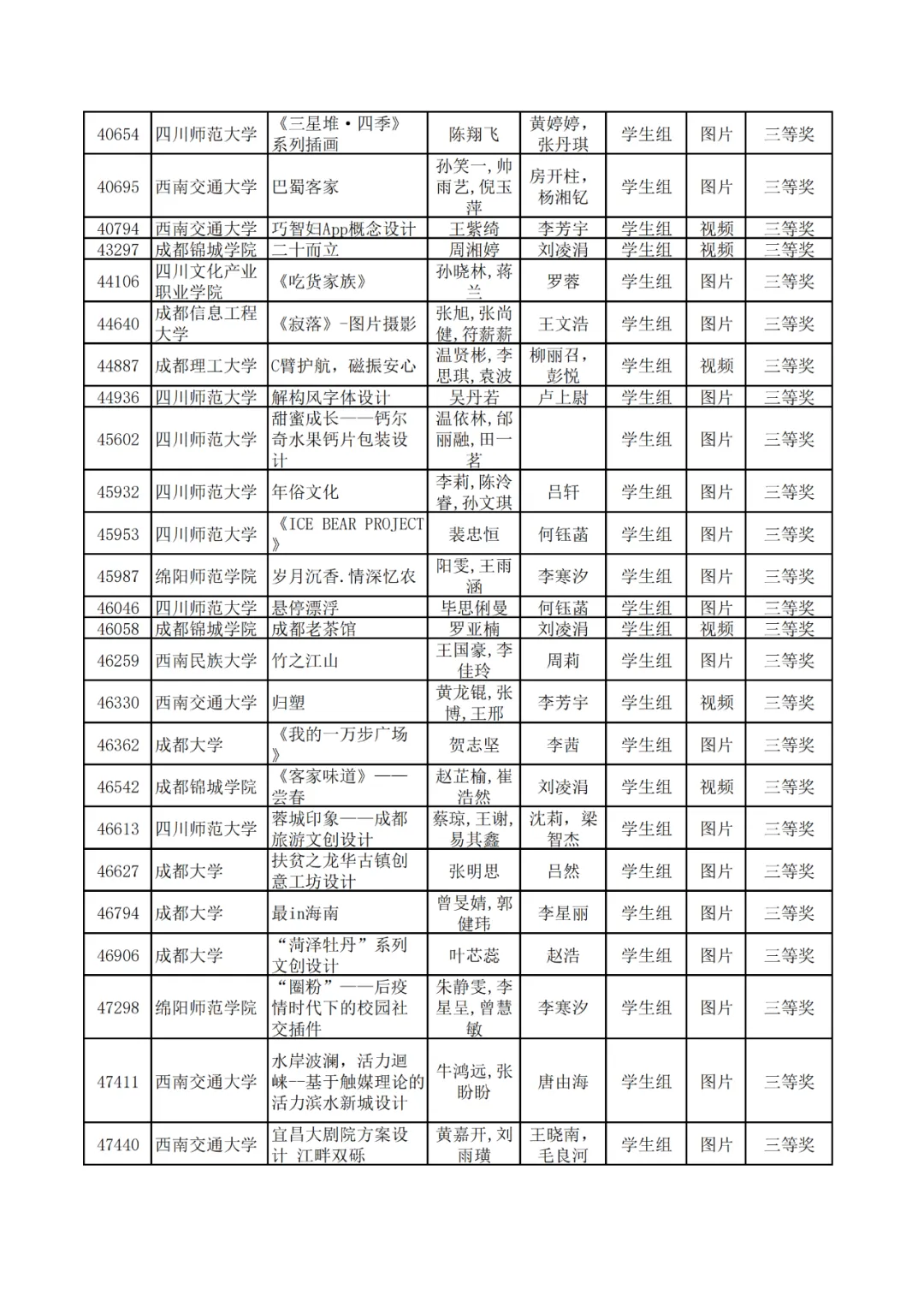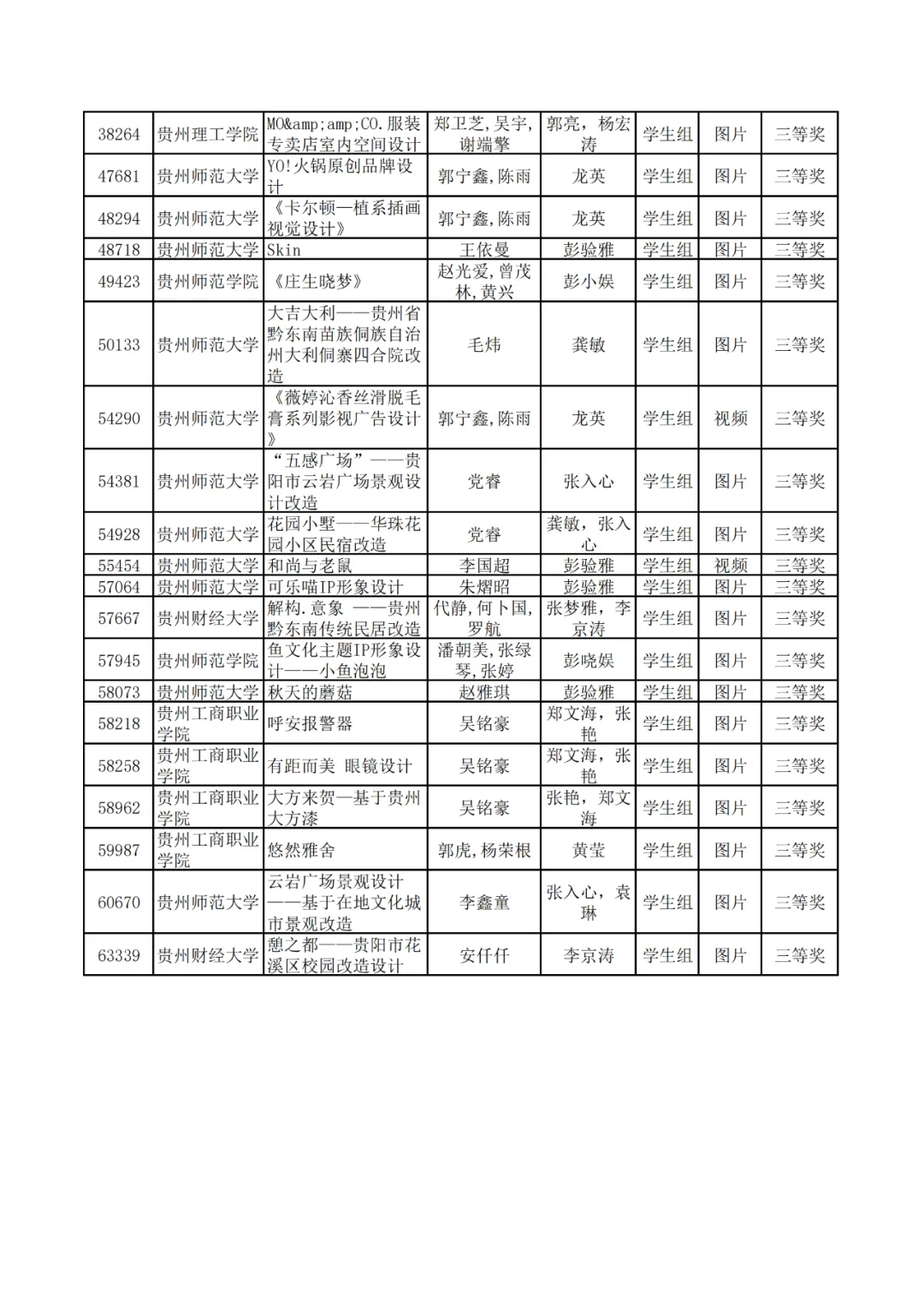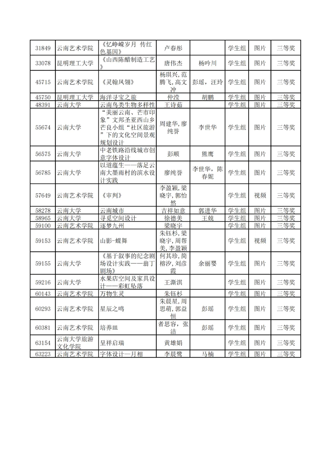 学生组获奖作品表。