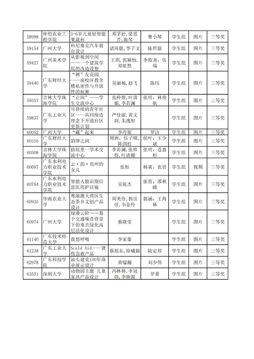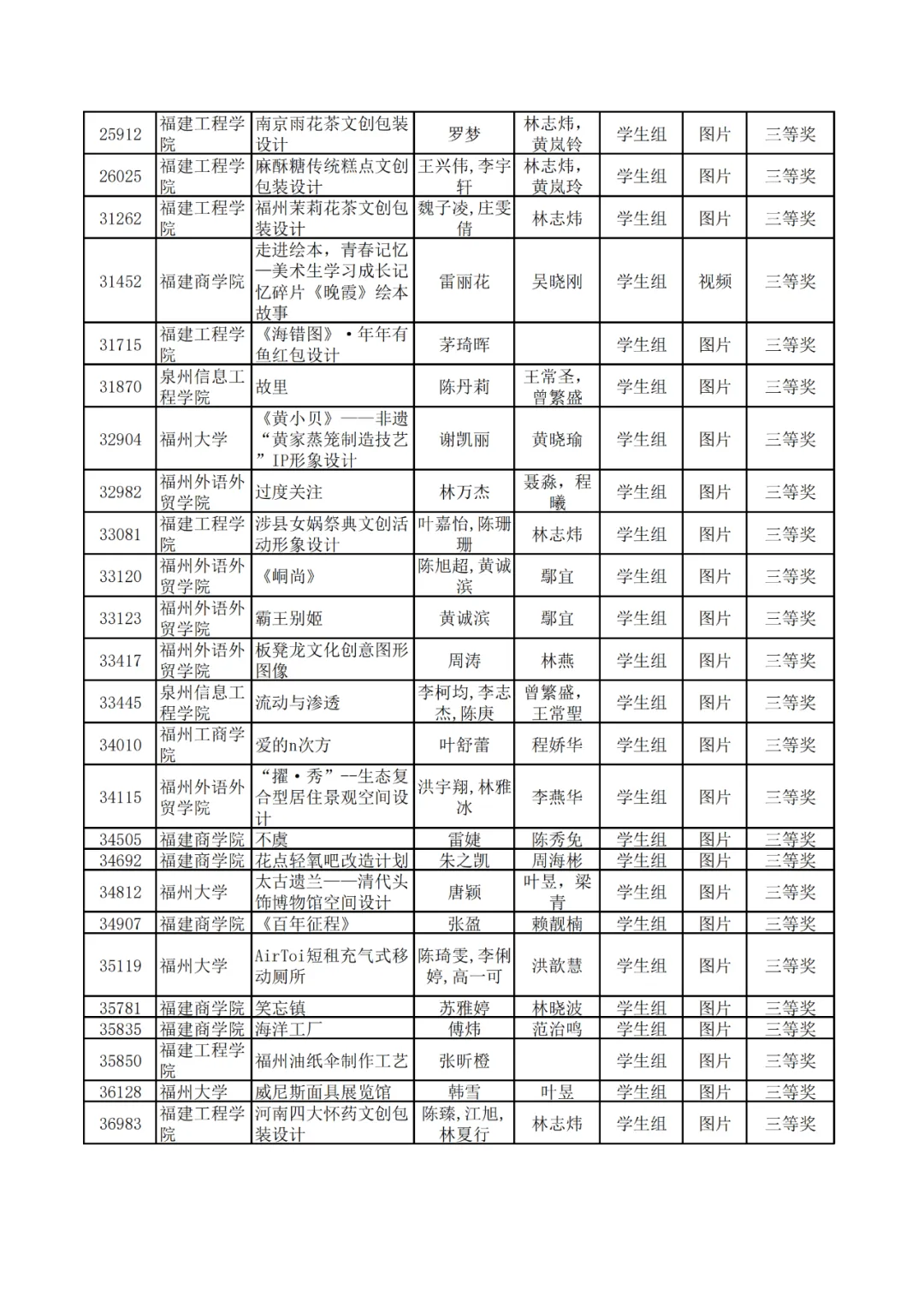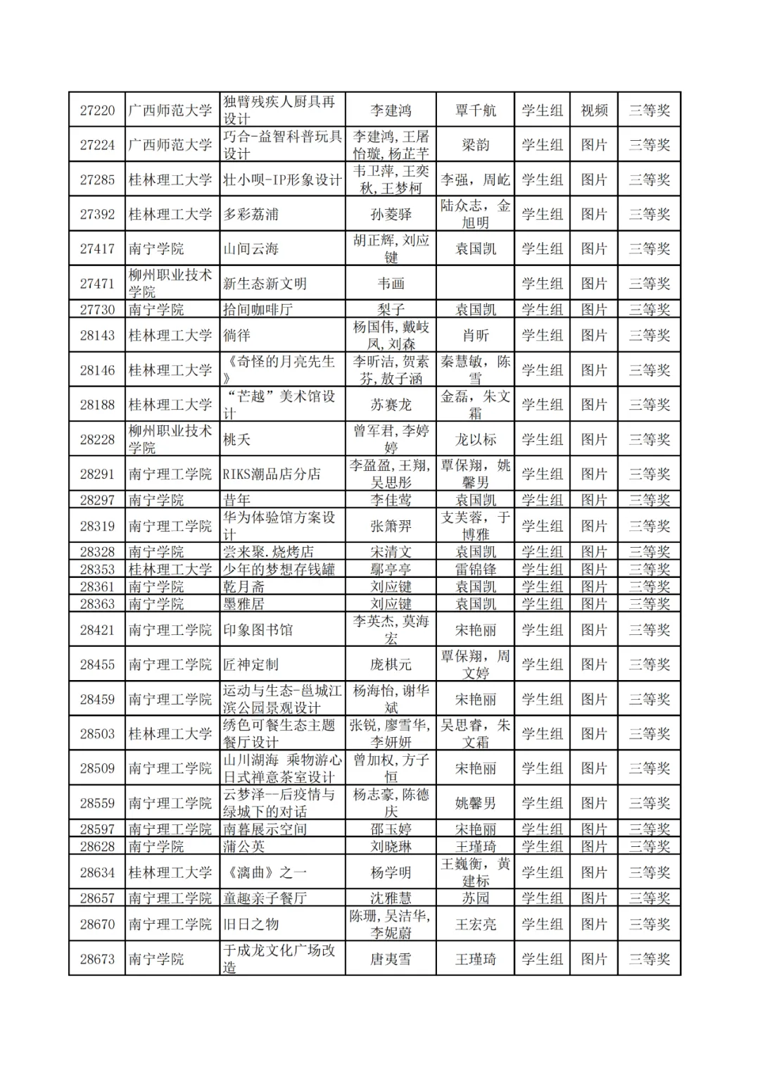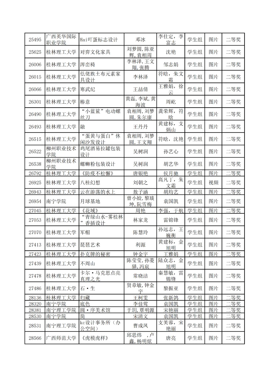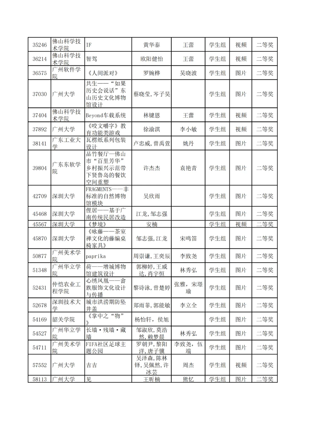 学生组获奖作品表。
