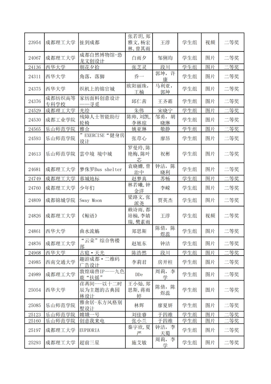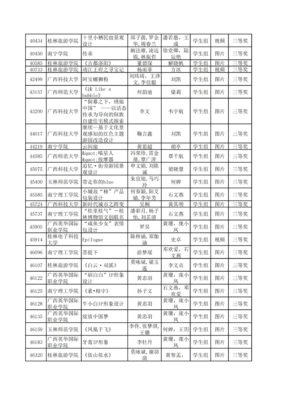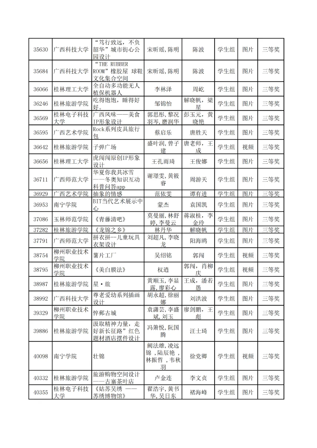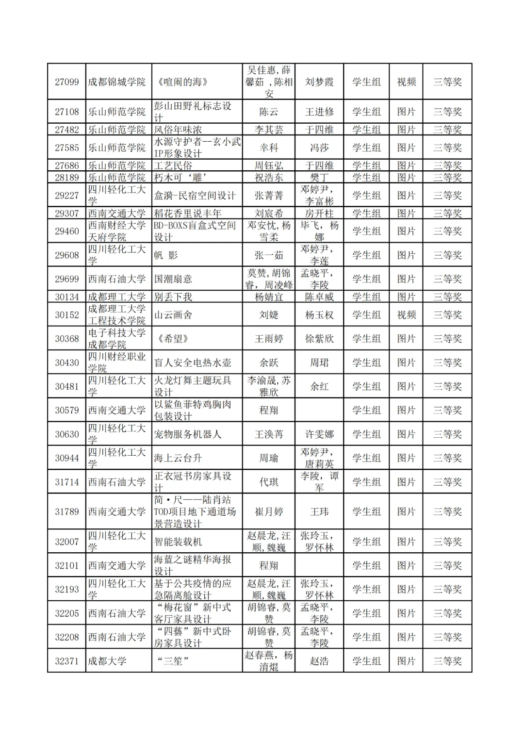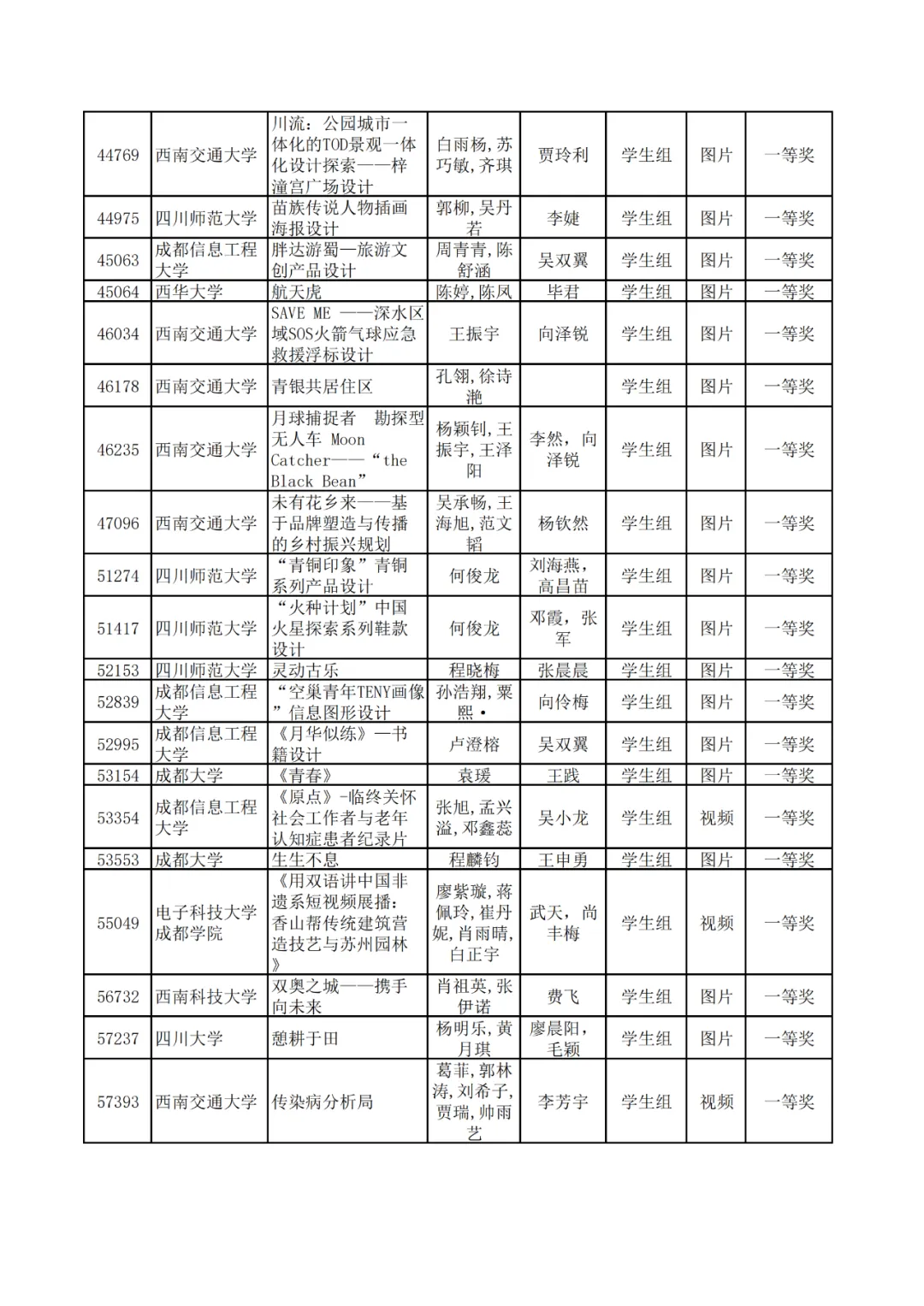学生组获奖作品表。